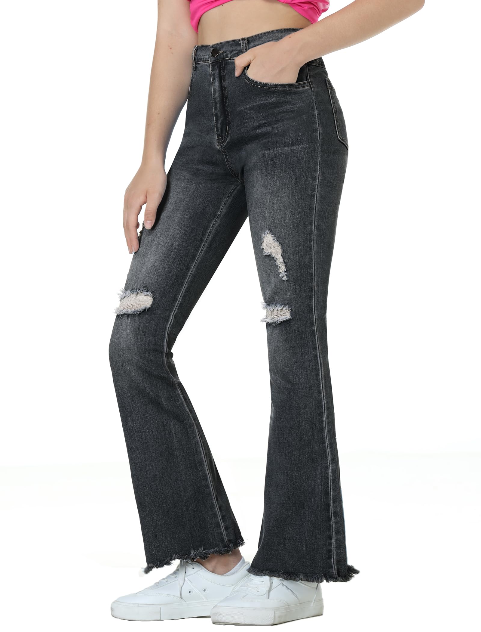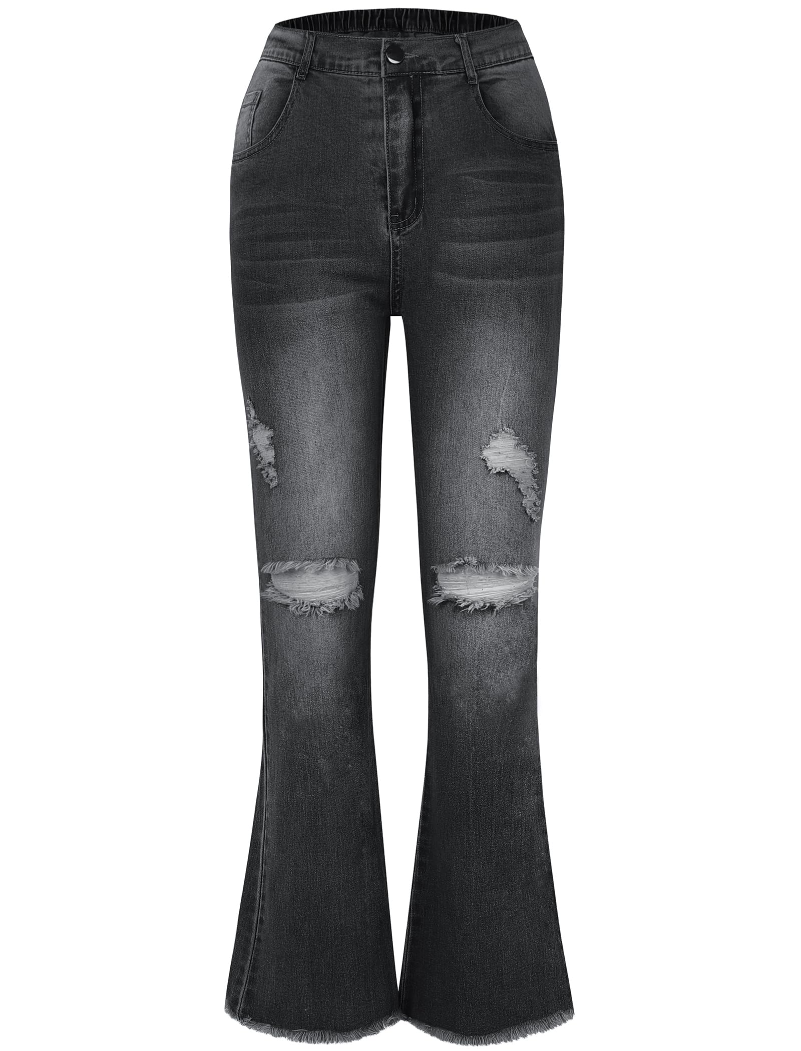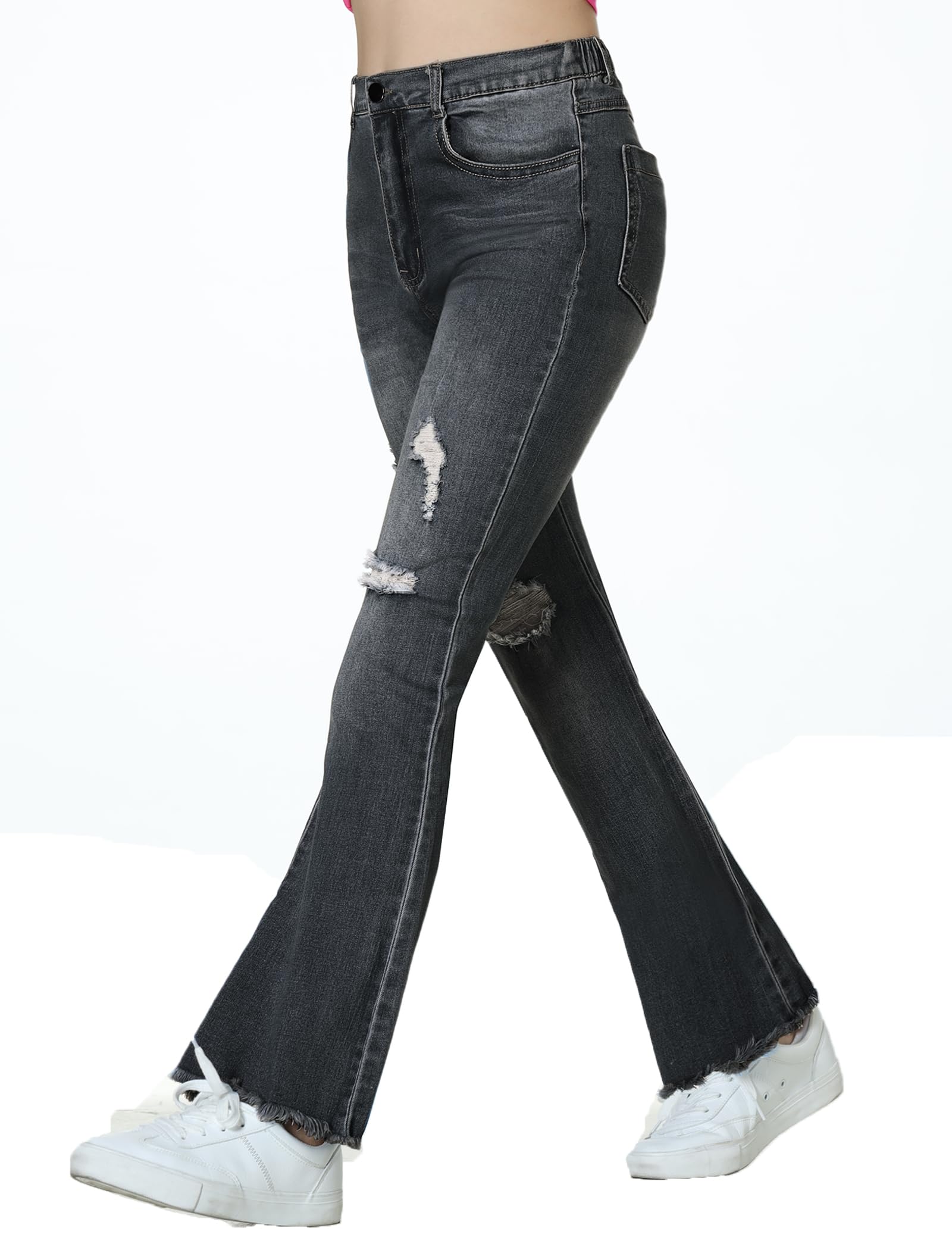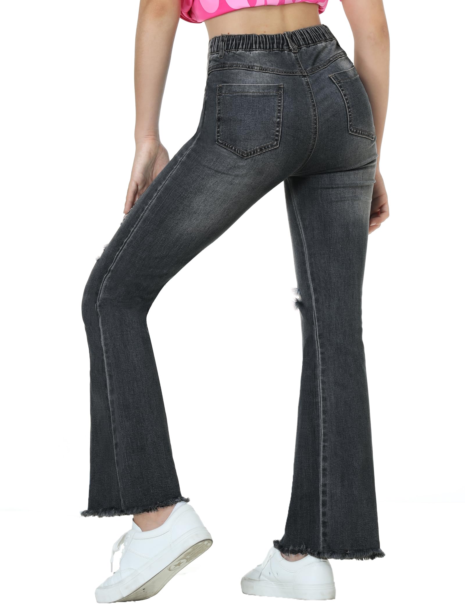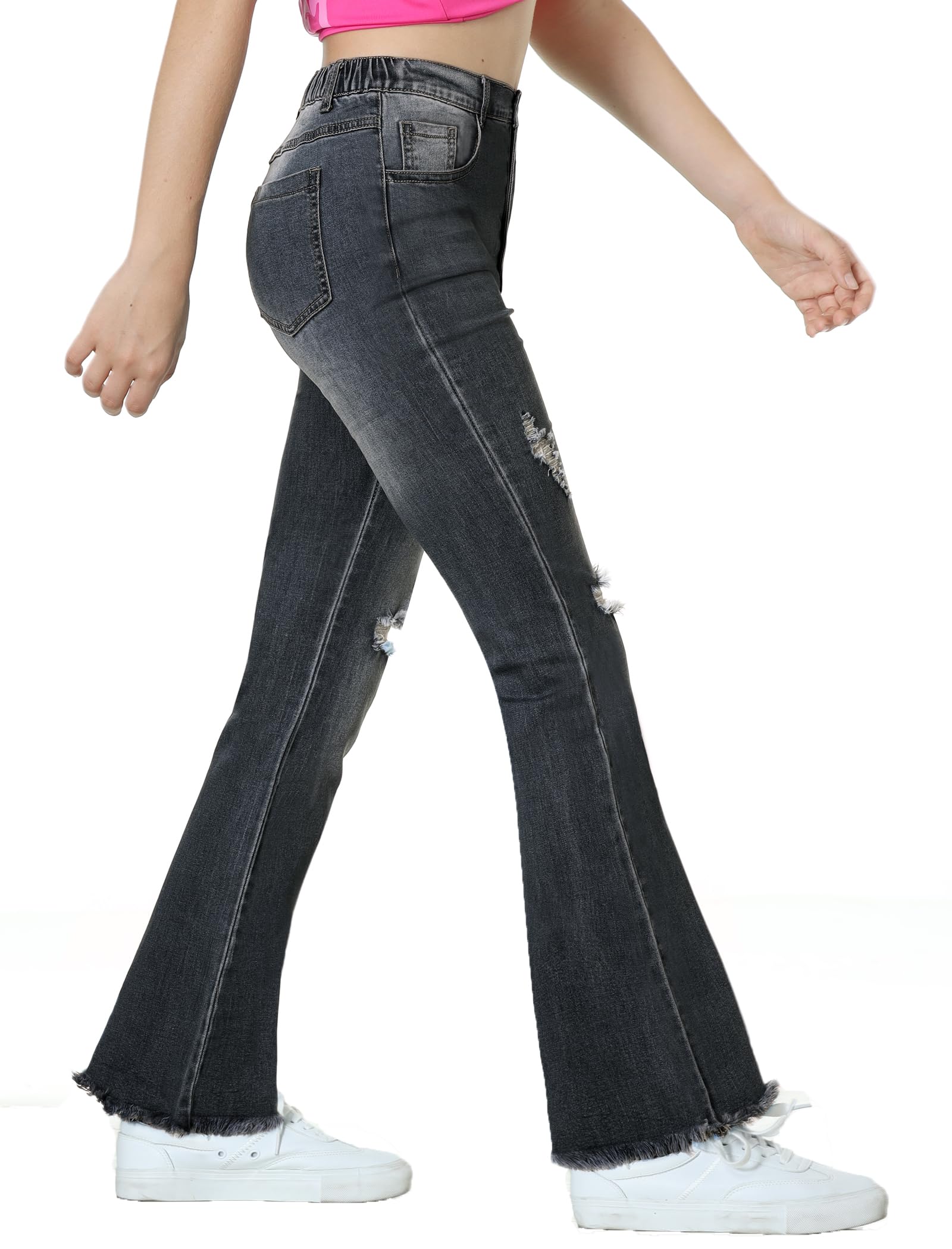 Ripped Flared Jeans: Girls flared jeans feature a ripped and distressed design with an elastic waist. The slim fit flatters natural curves, while the pant legs are finished with a frayed flared hem for added chic appeal