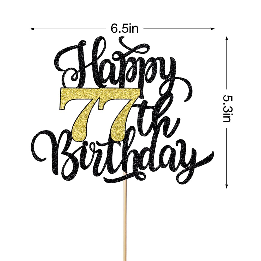 Happy 77th Birthday Cake Topper, Black Gold Glitter Birthday Cake Topper, 77th Anniversary/ 77th Birthday Party Decoration Supplies