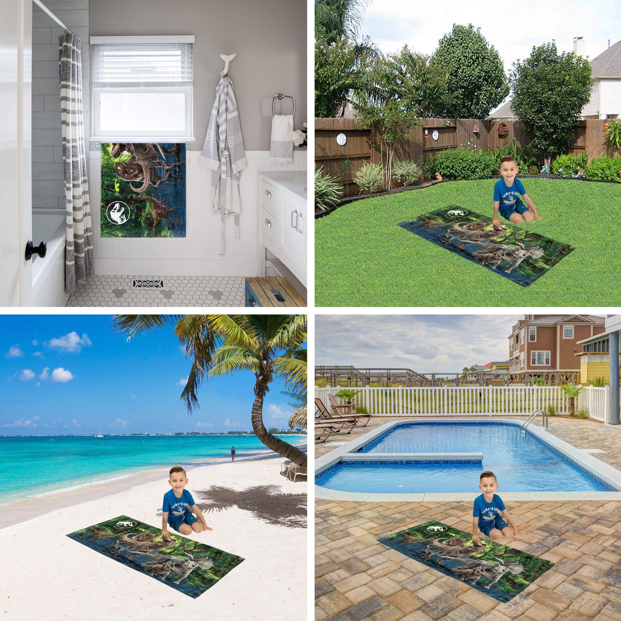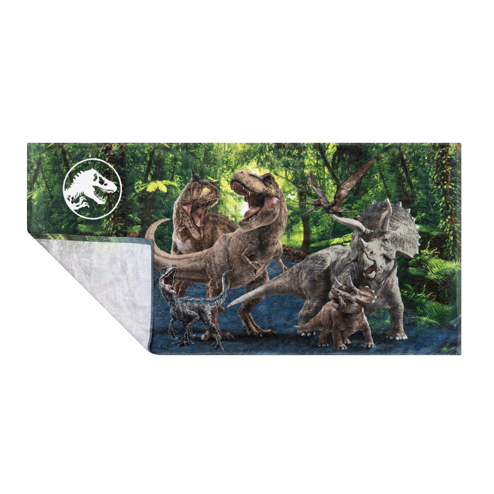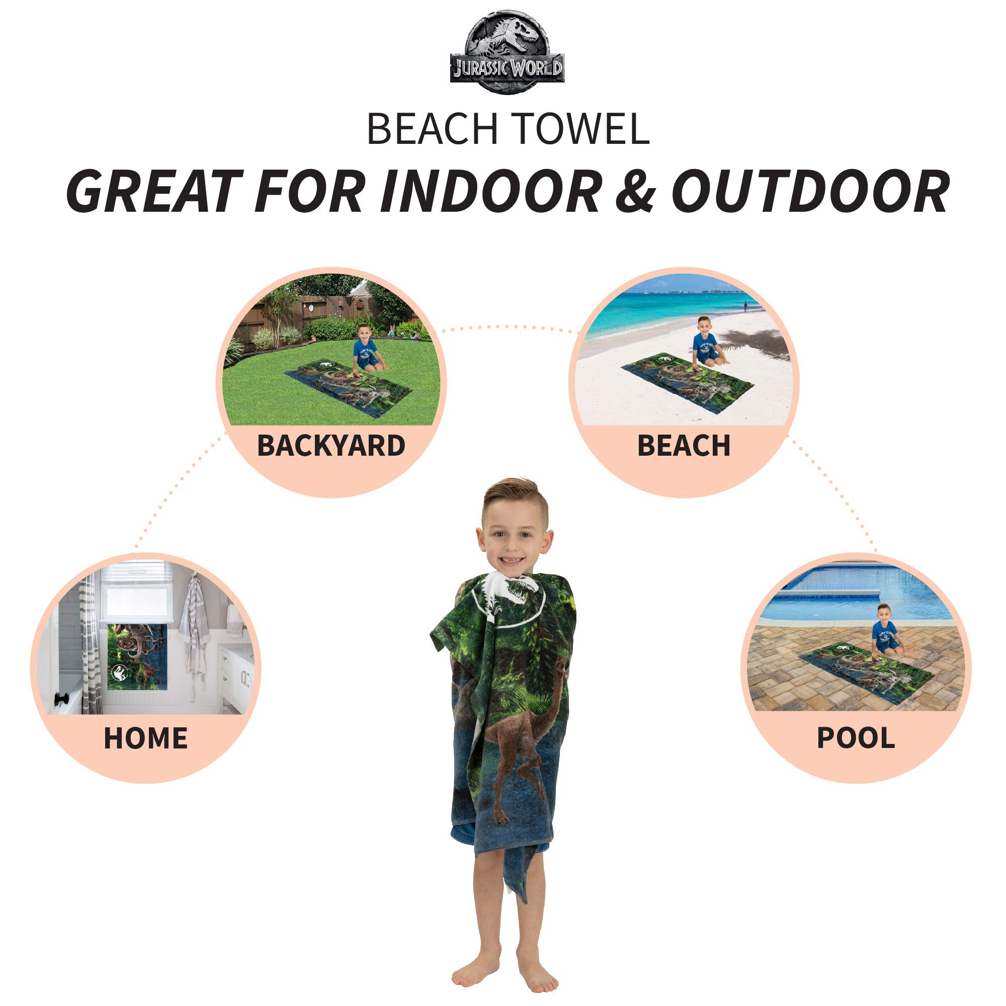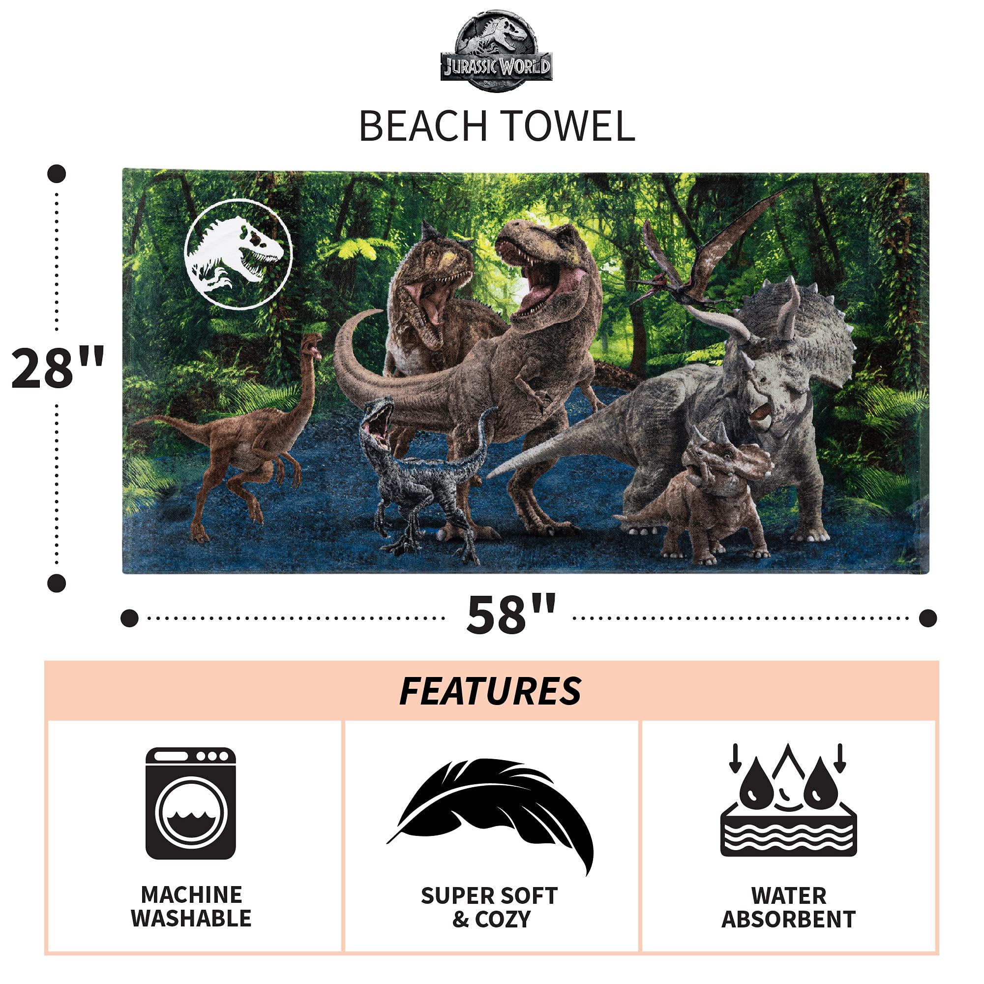 JURASSIC WORLD DESIGN: Your kids will go wild for the prehistoric style of this cool and colorful beach towel. This Family Reunion patterned towel features dynamic dinosaur imagery from Universal's blockbuster film Jurassic World.