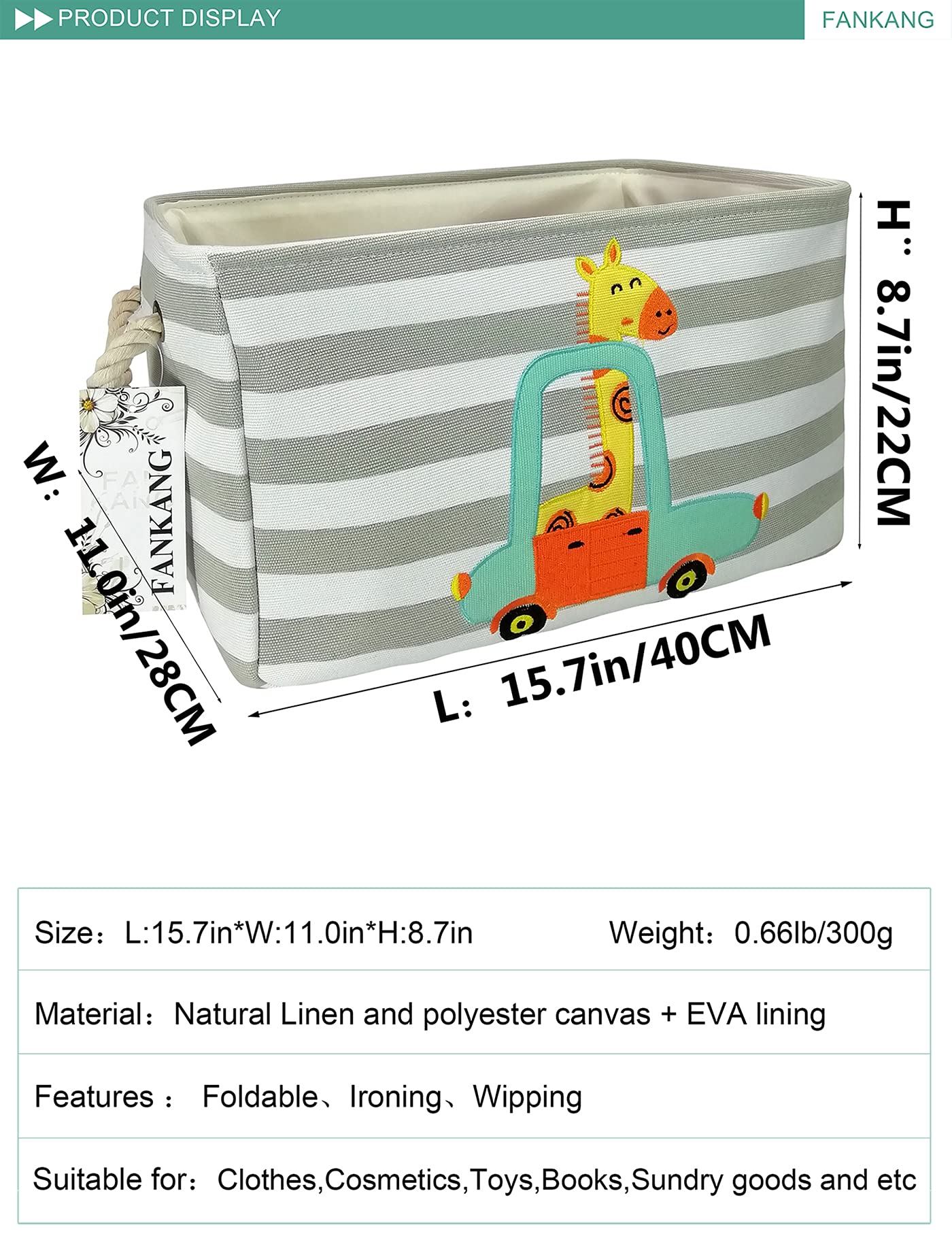 This storage bag suitable for adult, teens, kids,; suitable for toys, clothes and other stuff, suitable for home and office. Why choose our large storage basket? - Spacious capacity, store more stuff. - Convenient side handles for easy toting. - Collapsible design for compact, convenient storage. - Cute lovely animal pattern design. - Multiple function, suitable for any place. Features: - Perfect organizer for play rooms, allowing for the storage of toys, blocks, stuffed animals, toys with multiple pieces, train sets, or board games. -Reading materials, as well as in the bathroom for towels, or as a laundry hamper.