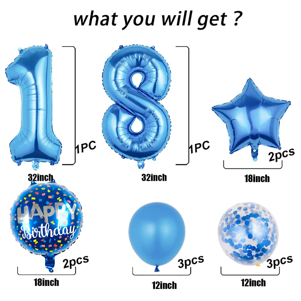 Package comes with 2pc 32 inch Number 18 Foil Mylar Balloons, 2 pcs 18 inch Letter Balloon, 3 pcs 12inch blue latex balloon, 3 pcs 12 inch blue confetti balloon, 2 pcs 12inch stars,1 ribbon.