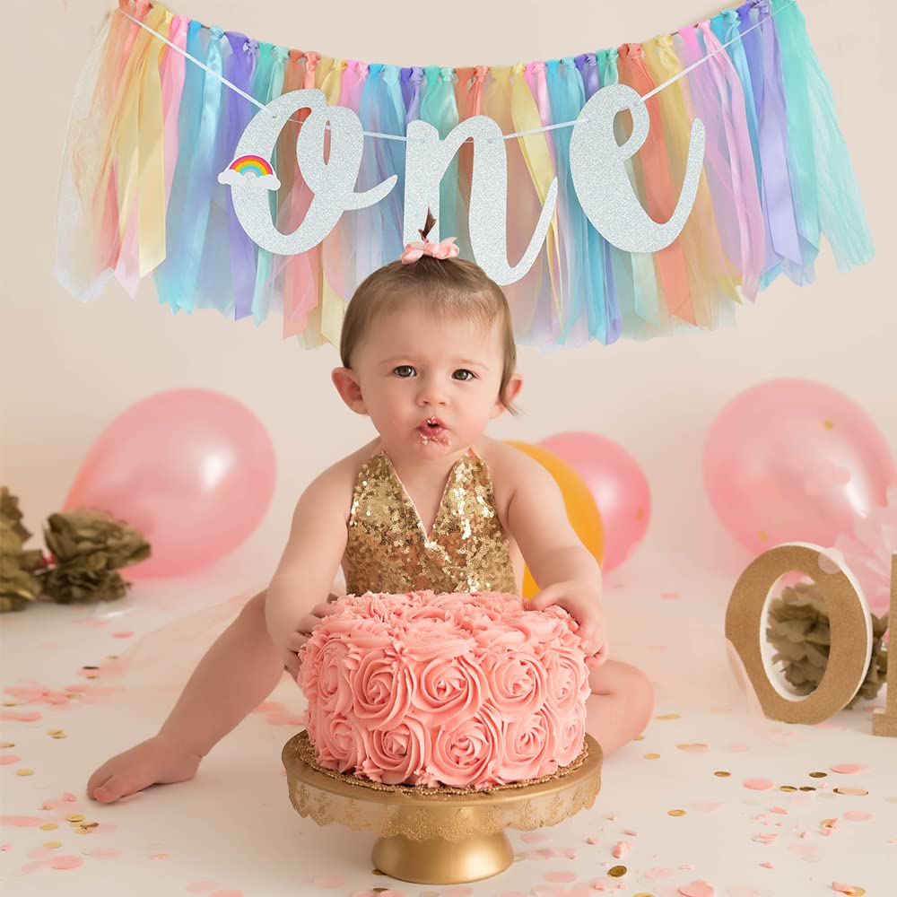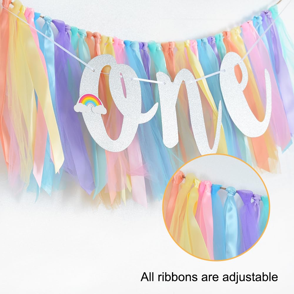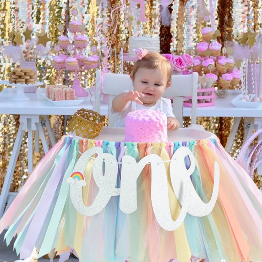 Party Banner for Your Kids - This colorful birthday theme banner is made of beautiful colored tulle and ribbon, like a rainbow, and is equipped with silver flash cards, which can be used to decorate the high chair of the kid's first birthday party.