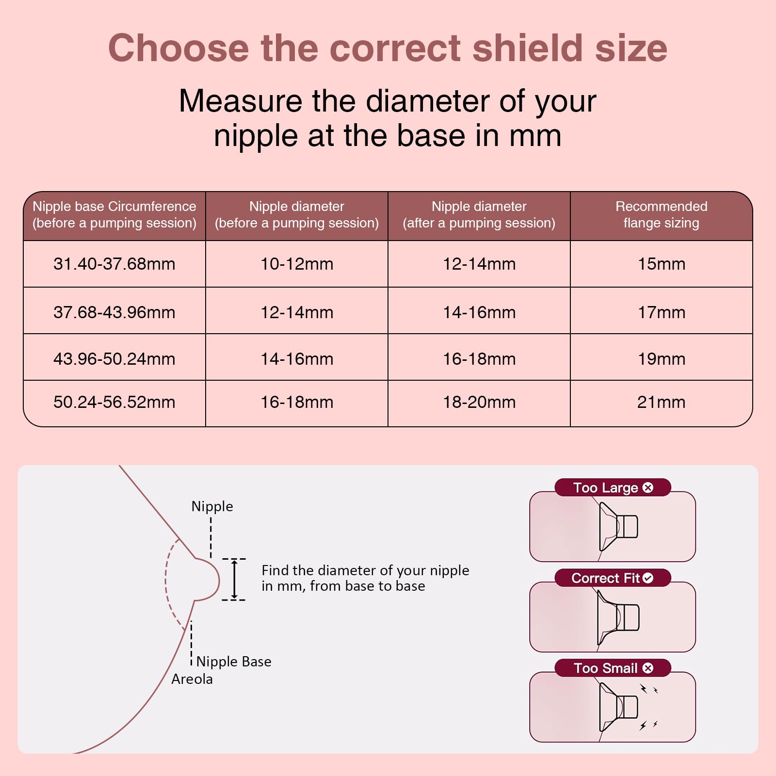 ✅【 Getting Right Size 】Using our silicone nipple measurement card can help you accurately measure changes in size during different stages of breastfeeding, and replace the most suitable flange in time to ensure maximum comfort and pumping efficiency. In the middle or late stages of breastfeeding, if there is little change of your nipple sizing, we recommend that you purchase a kit of the same size and eplacing them every 2-3 months to maintain optimal functionality.