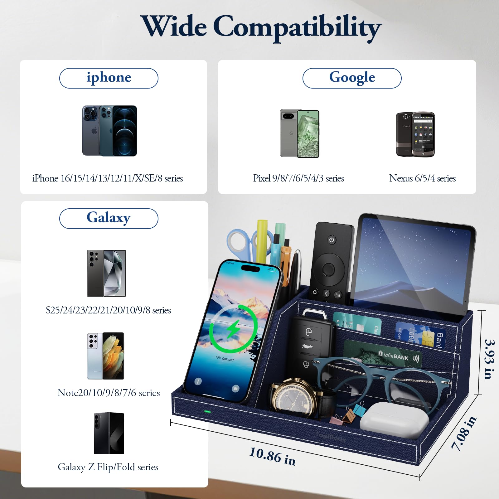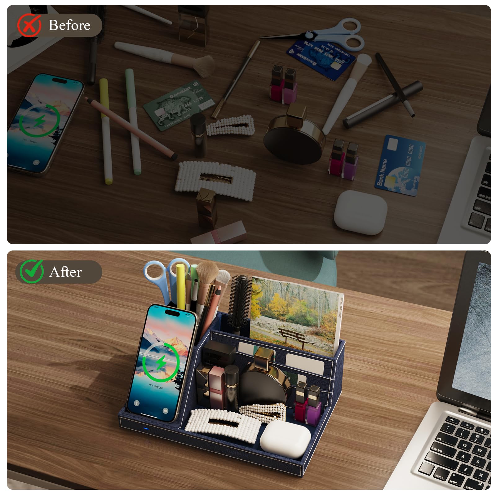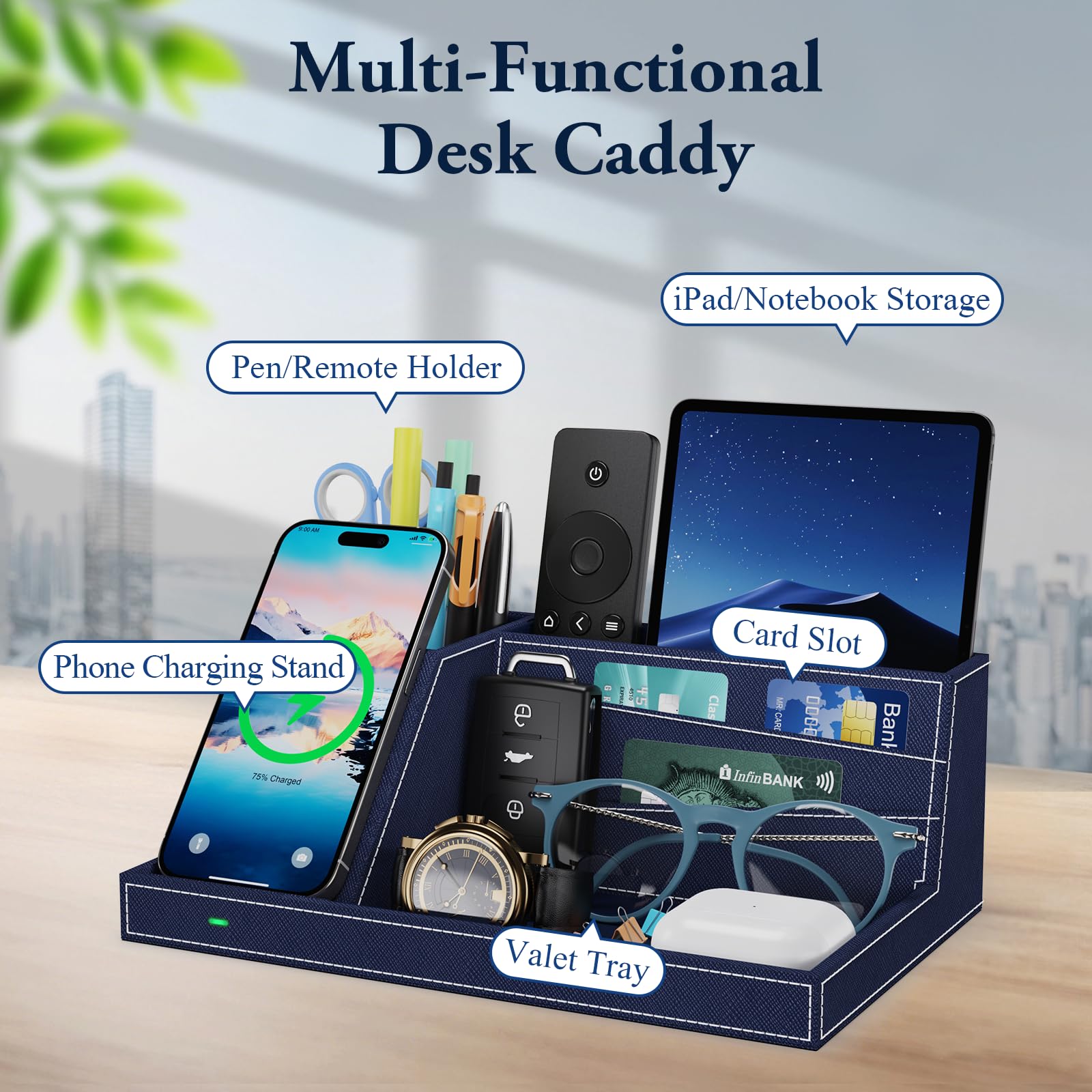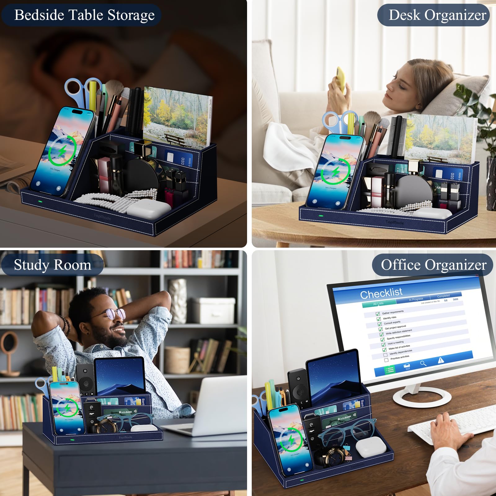 【Wireless Charger Nightstand Organizer】: Desktop organizer is designed with a wireless charging stand, a pen holder, a valet tray, a large storage folder and 2 card slots, for all EDC items to keep your desk tidy