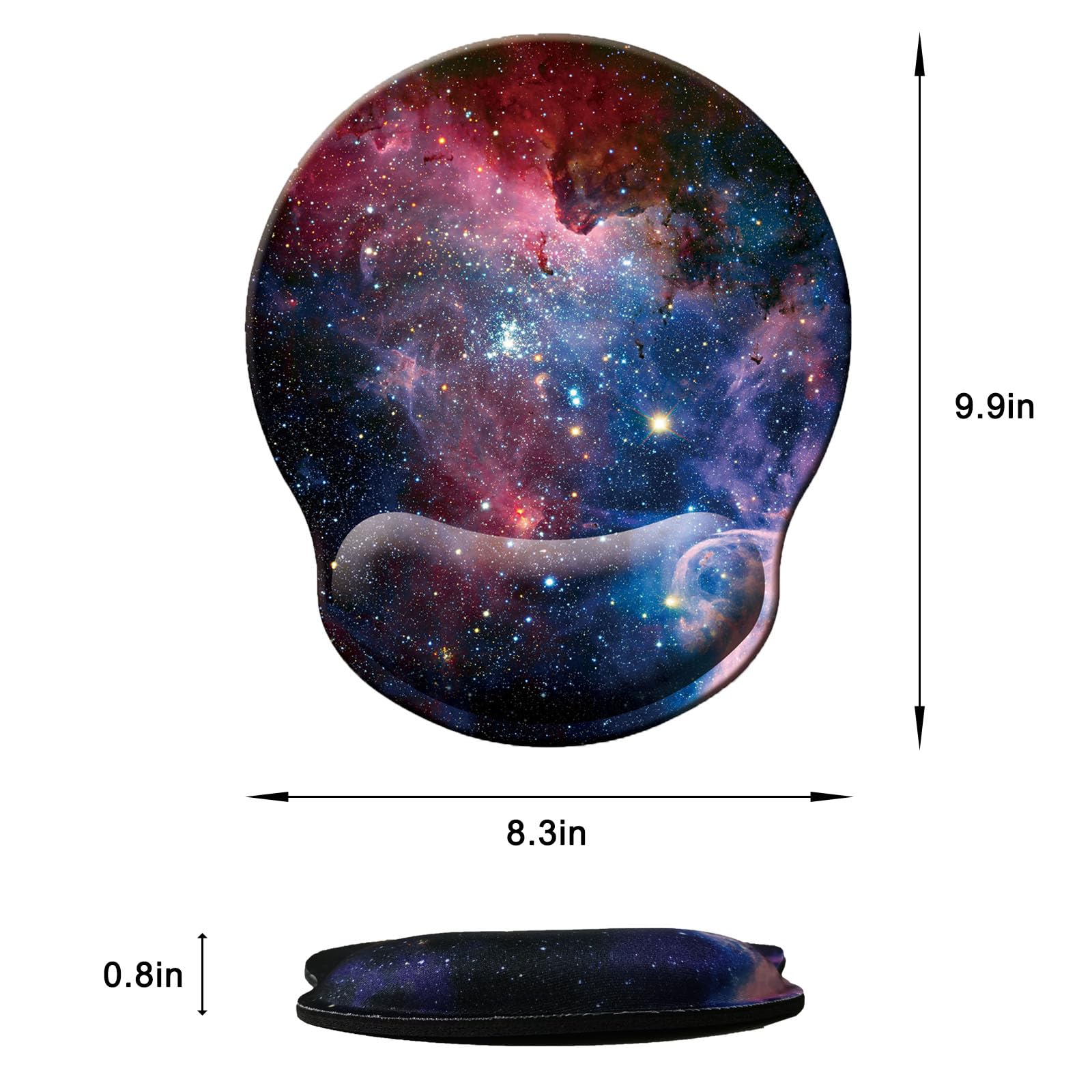 ERGONOMIC - Approximately 9.9 in x 8.3 in, 0.8 in thick. The reinforced edges are not easy to deform and damage, no curl up on edges. Ergonomic soft wrist rest mouse pad provide good touch and comfortable support for your wrists. Keep arms, wrists, and hands from getting sore when using computer for long time.