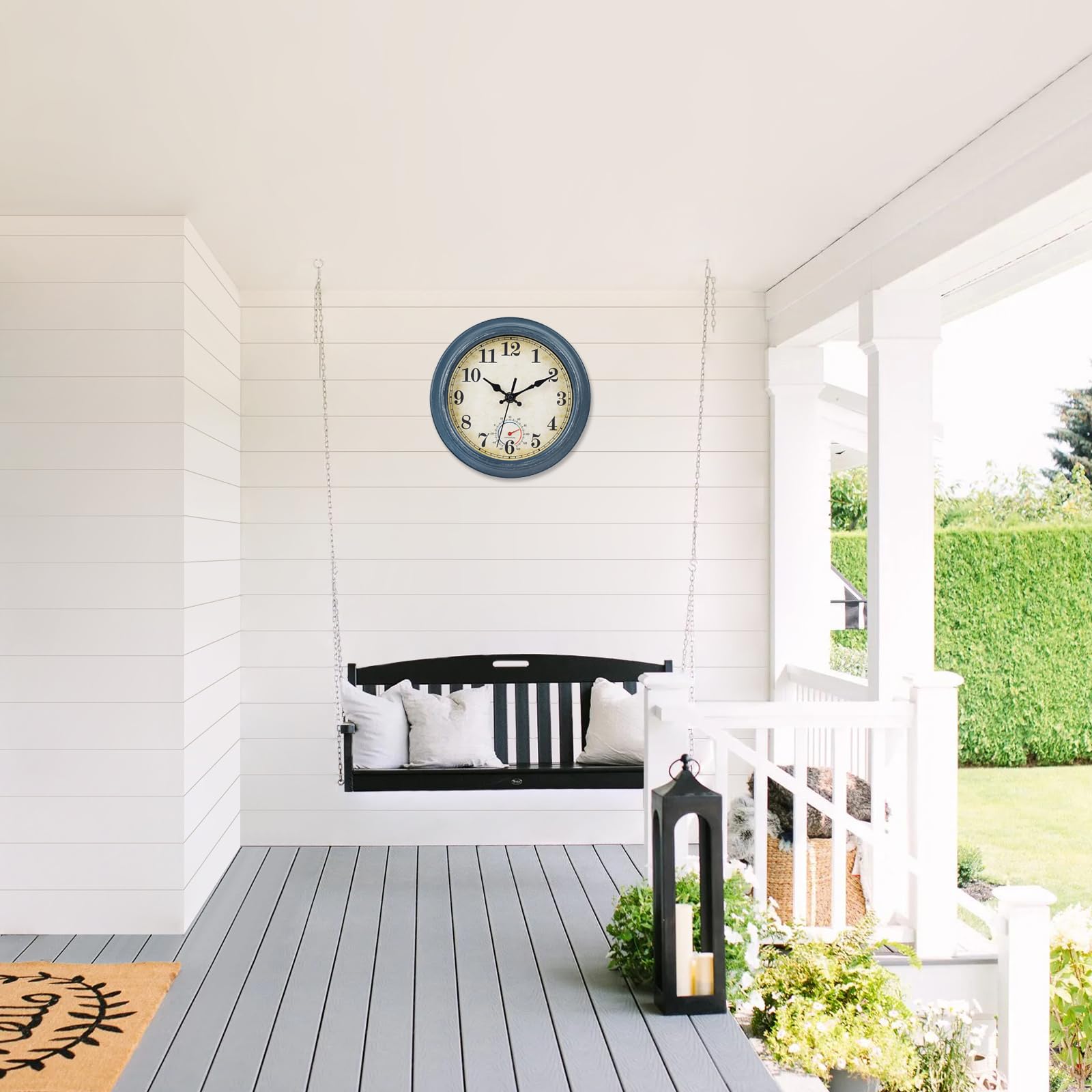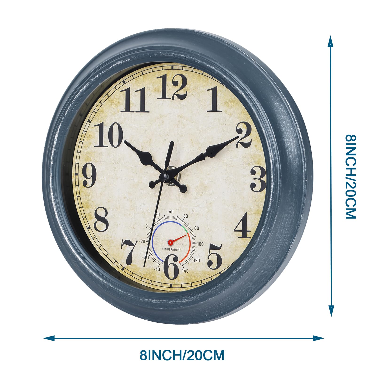 【Waterproof & Weatherproof】Ideal as an Outdoor Wall Clock, this 8-inch blue piece features a vintage look, making it a great decor choice for gardens, patios, bathrooms, and pool areas. The waterproof design ensures longevity, and the built-in thermometer adds practicality, keeping you updated on the weather.