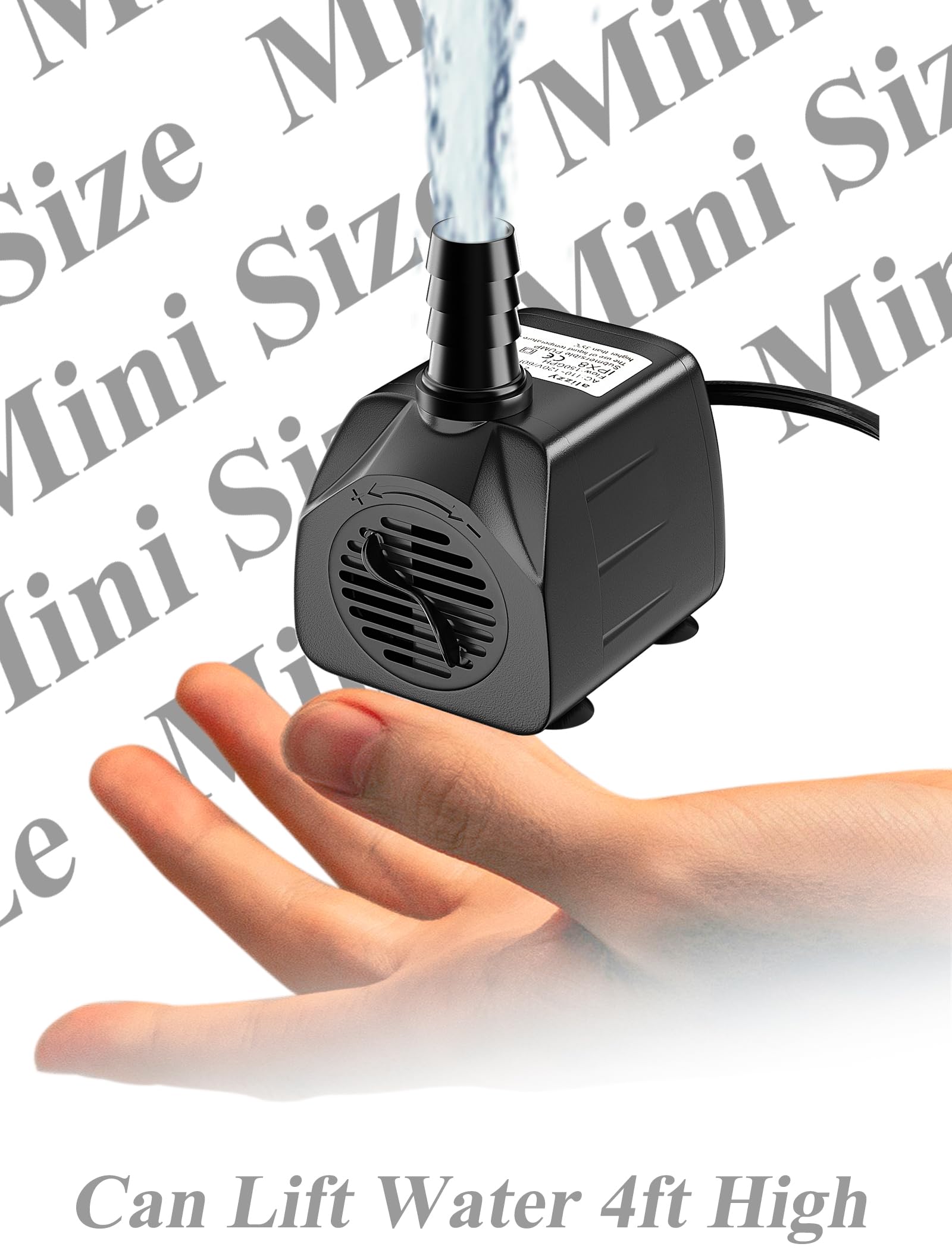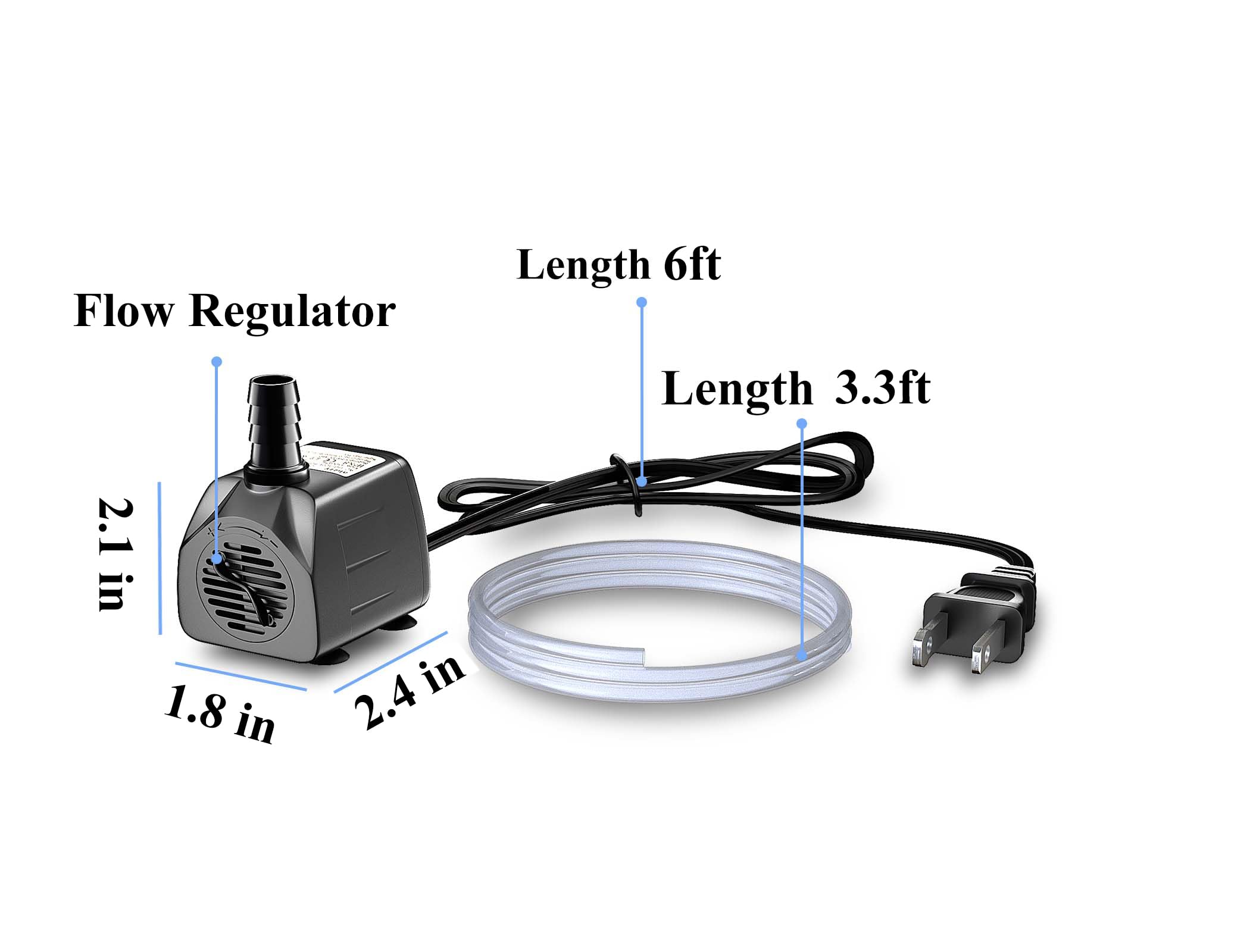 【Dimensions & Specs】: 2.4*1.8*2.1 inches; Max flow rate: 150 GPH (570L/H); Max lift height: up to 4 ft., Wattage: 10W; Voltage: 110-120V, Power Cord: 6ft., Tube: 3.3ft..