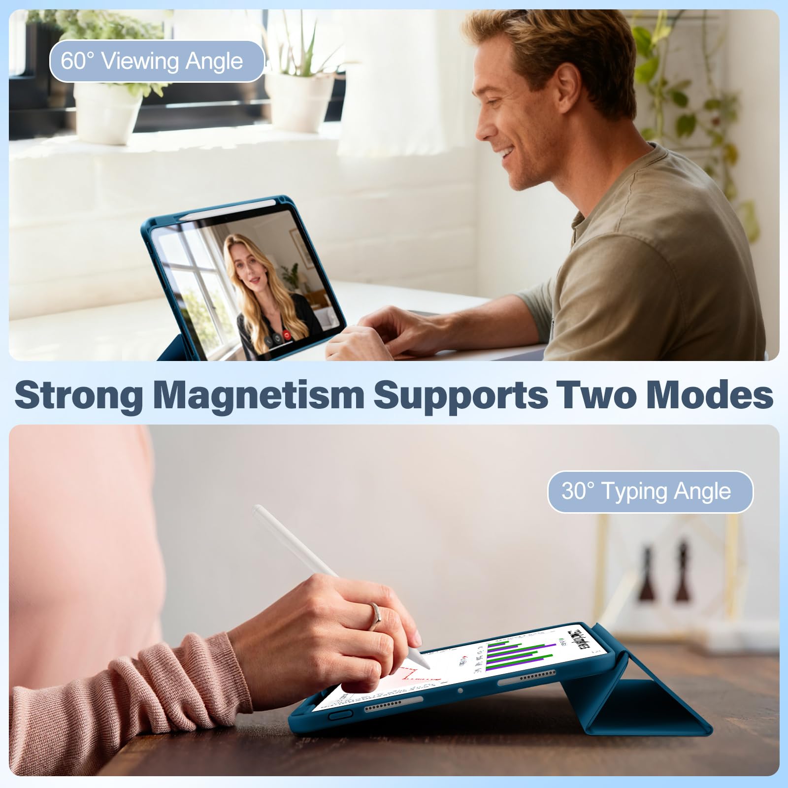 【Typing Angle/Viewing Angle】This apple iPad Pro 11 inch case features a tri-fold design, and when folded, the triangular stand provides exceptional stability. The case offers two daily-use angles: the 30° angle is ideal for drawing, typing, or chatting, while the 60° angle perfectly suits scenarios like watching videos, video calls, and handling emails.