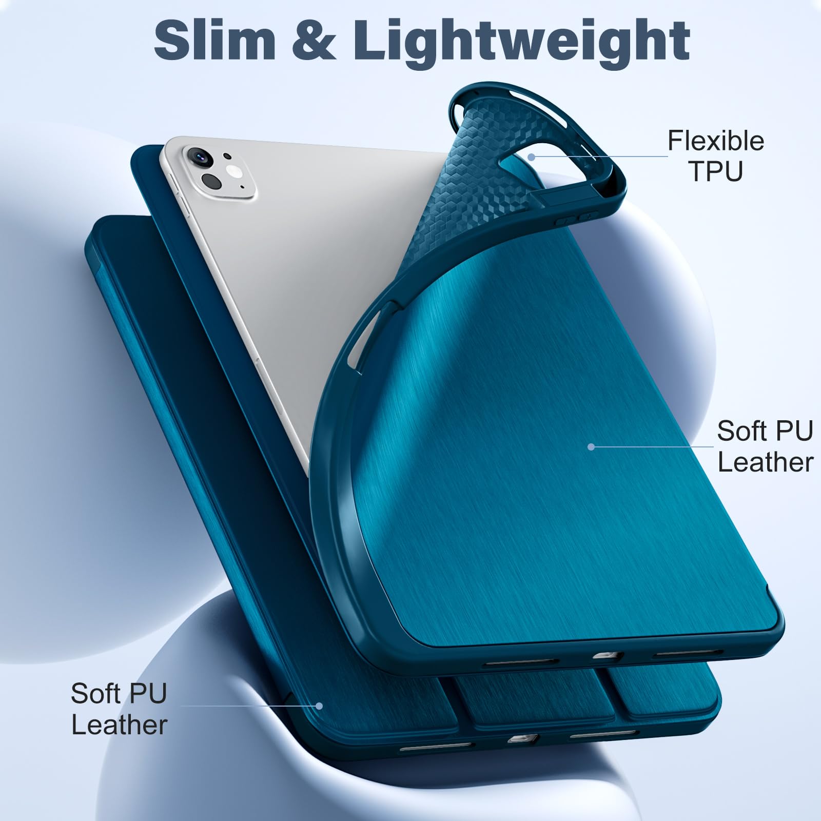【Full Protection】The outer layer of the iPad Pro 11 inch m5 case is crafted from PU leather, offering a soft and comfortable feel. The inner shell frame utilizes shock-absorbing TPU material, providing exceptional drop and impact protection.