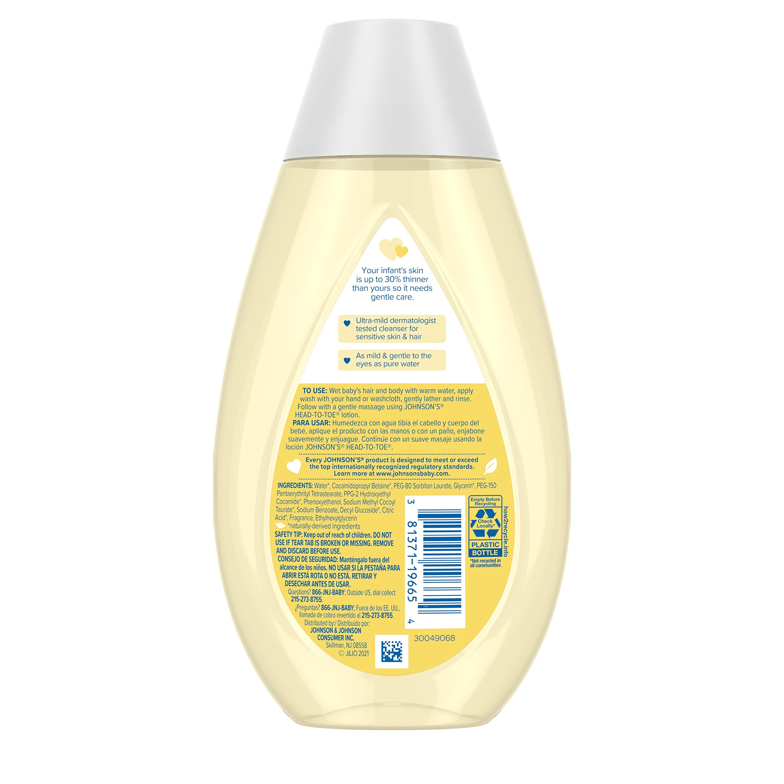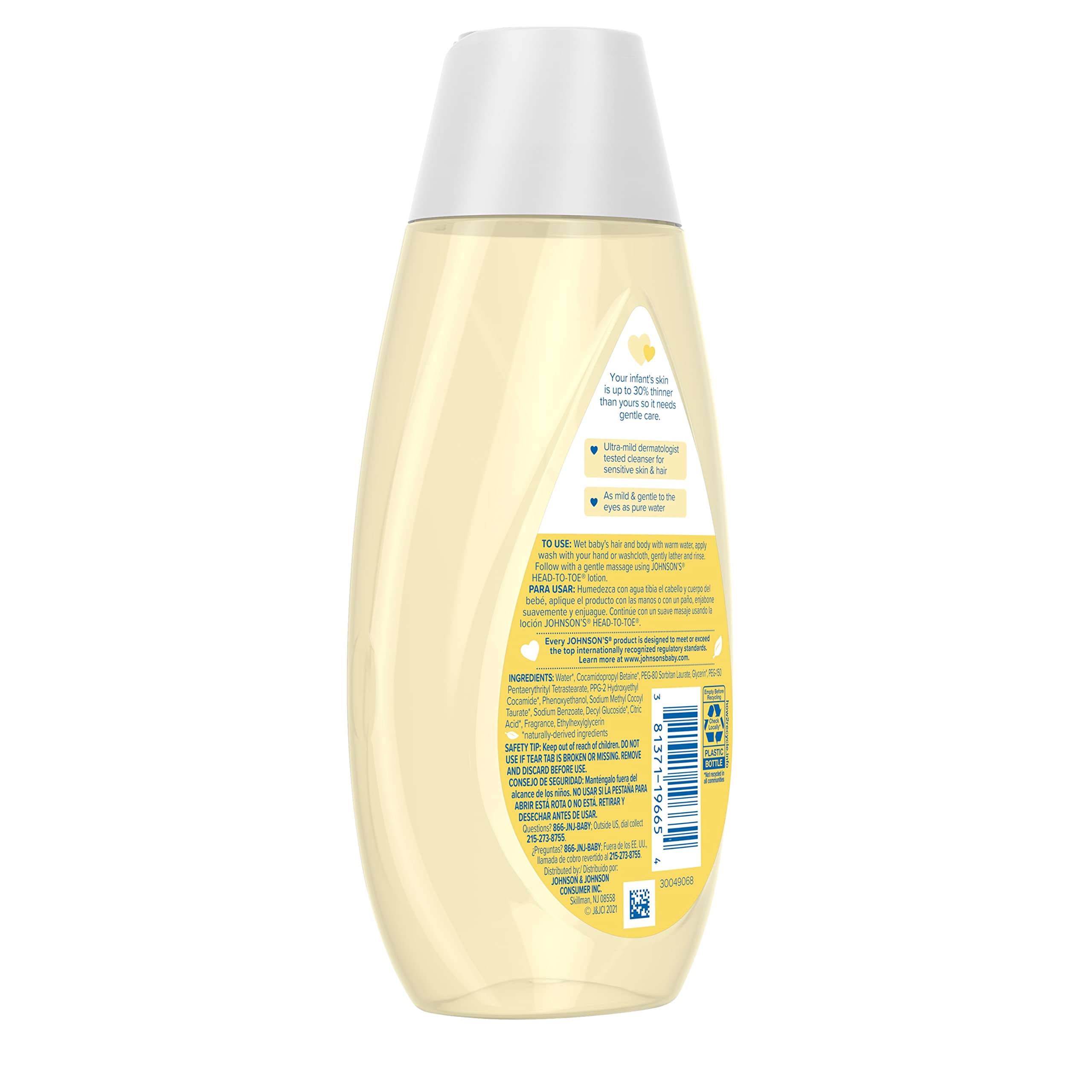 Gentle enough for newborns and good for the whole family, Johnson's Head-To-Toe Baby Wash & Shampoo helps make bath time bonding time with your baby. This ultra-mild baby bath wash & shampoo is pediatrician-tested and pH-balanced to baby skin and washes away 99.9% of germs. Containing over 90 percent ingredients of natural origin,* this sulfate-free baby shampoo and cleanser is gentle enough to cleanse baby's sensitive skin. The Johnson's No More Tears formula makes this baby wash tear-free and as gentle to your baby's eyes as pure water. This baby body wash and hair shampoo contains no harsh fragrances, parabens, phthalates, or dyes & Johnson's does not test on animals. Apply the hypoallergenic baby wash & shampoo with warm water using your hand or a washcloth, gently lather, rinse, and follow with a gentle massage using Johnson's Head to Toe Baby Lotion. *Based on average cumulative volume of ingredients in Johnson's Head-To-Toe wash & shampoo, using ISO DIS 16128 (water included).