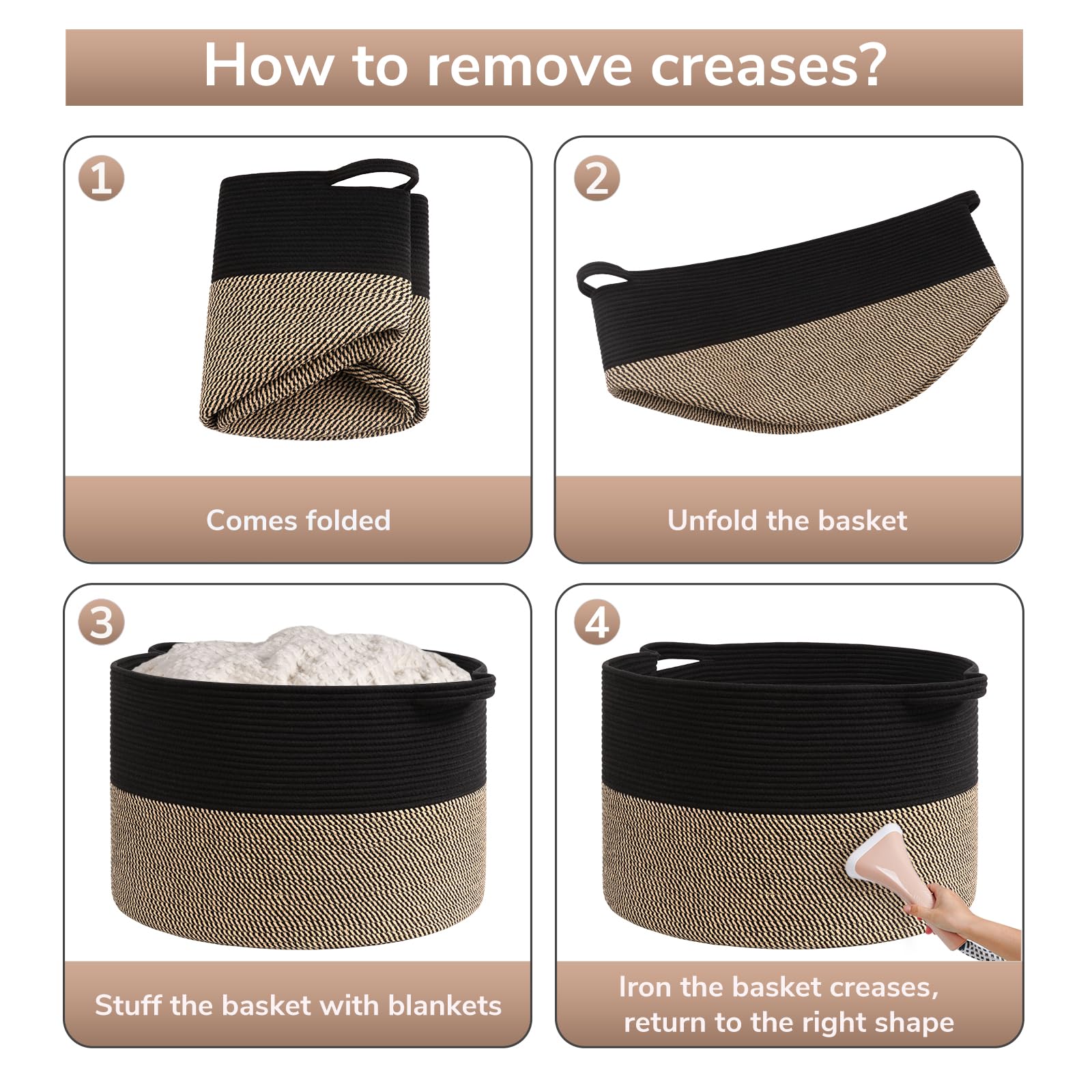 Note: Hand washing or machine washing with gentle detergent. The towel basket comes folded. It’ll return to its best shape while filling blankets and pillows, and ironing is a great idea as well