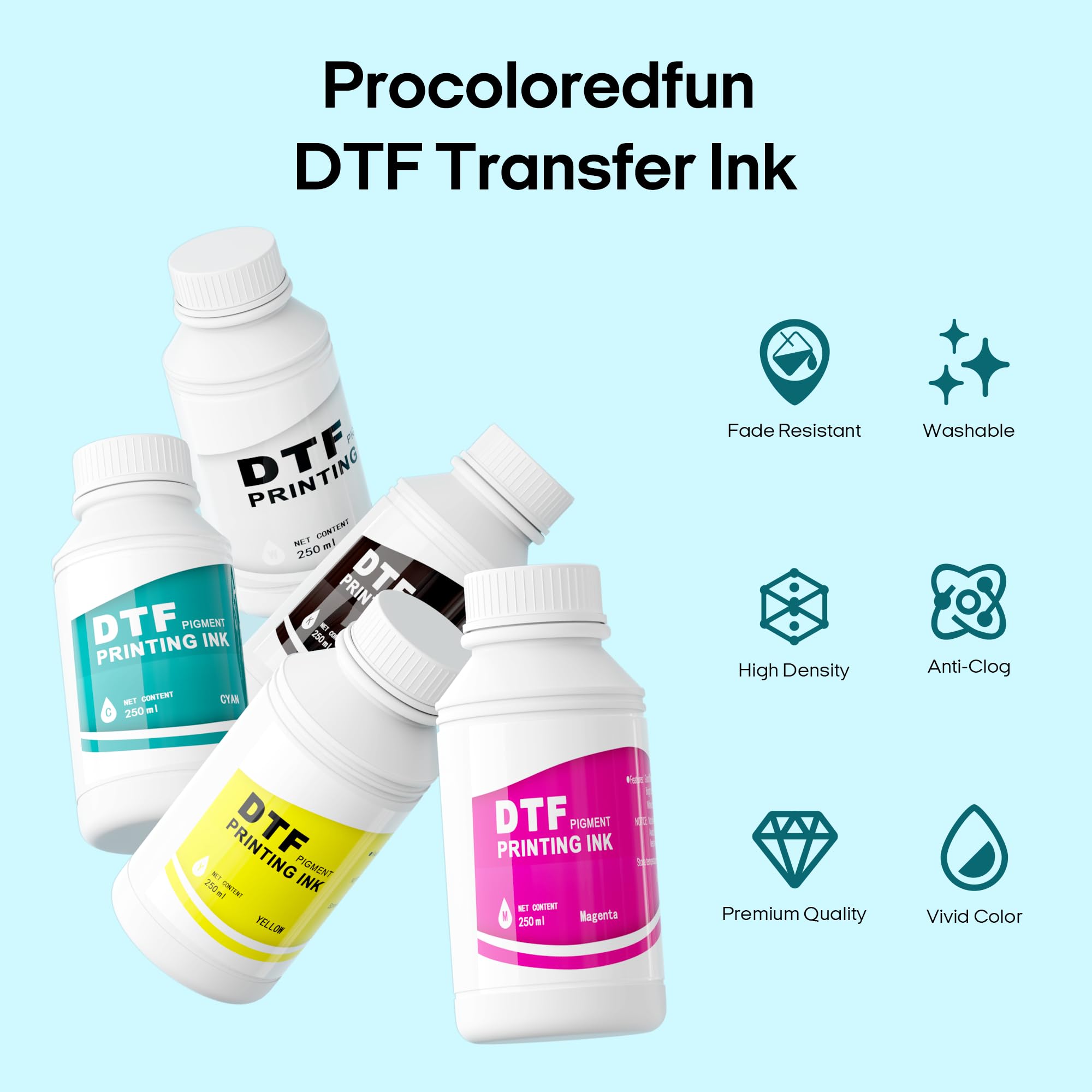 [Compatibility] Procoloredfun DTF transfer ink is suitable for print heads L1800, L800, 1430, ET-8550, ET8500, XP15000, P400/P408, P600/P608, P800, R1390, R1800, R1900, R2000, R2400, R2880, R3000, 3880, 4880, 7880 printers, etc. Can be used with Procoloredfun DTF transfer film and DTF powder, DTF printers and other DTF consumables