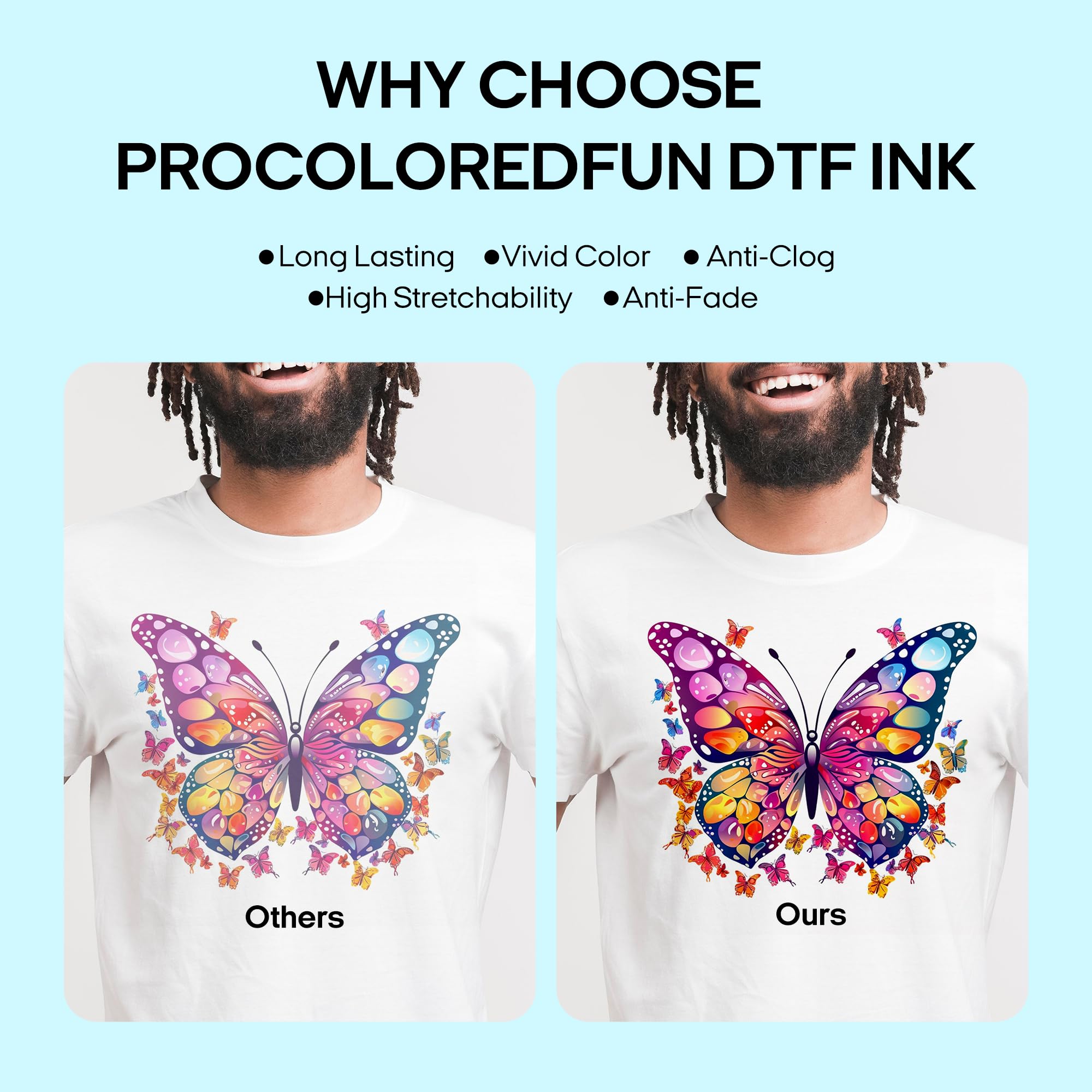 【Premium Quality】Procoloredfun DTF ink is made of high-quality materials, with smooth texture, high fluidity and anti-clogging performance. It also has the characteristics of high saturation, good permeability, fast drying, waterproof and good color fastness, which can ensure brighter colors, clearer images and better adhesion