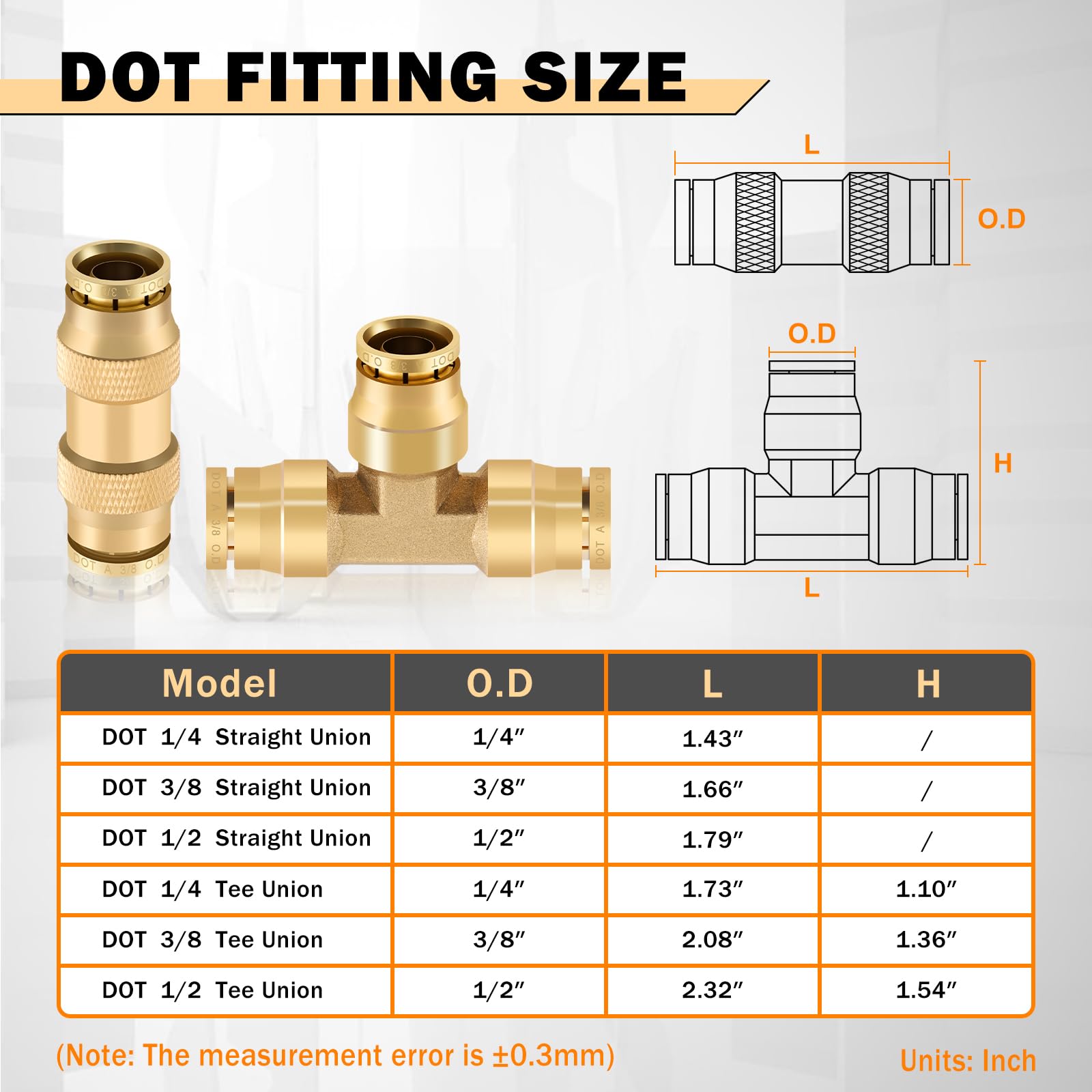 35 PCS PACKAGE: The 35 pcs DOT air brake fittings kit includes: 8 pcs 1/4 inch straight union DOT fittings, 8 pcs 3/8 inch straight union DOT fittings, 6 pcs 1/2 inch straight union DOT fittings, 4 pcs 1/4 inch tee union DOT fittings, 4 pcs 3/8 inch tee union DOT fittings, 4 pcs 1/2 inch tee union DOT fittings, 1 pc tube cutter. DOT quick connect fitting assortment types: 1/4", 3/8", 1/2"