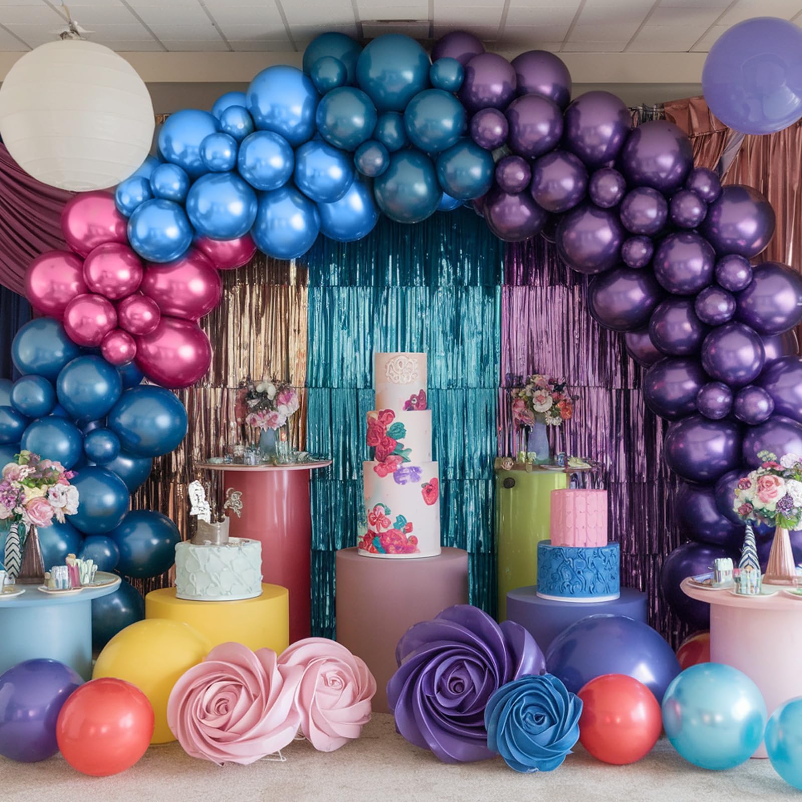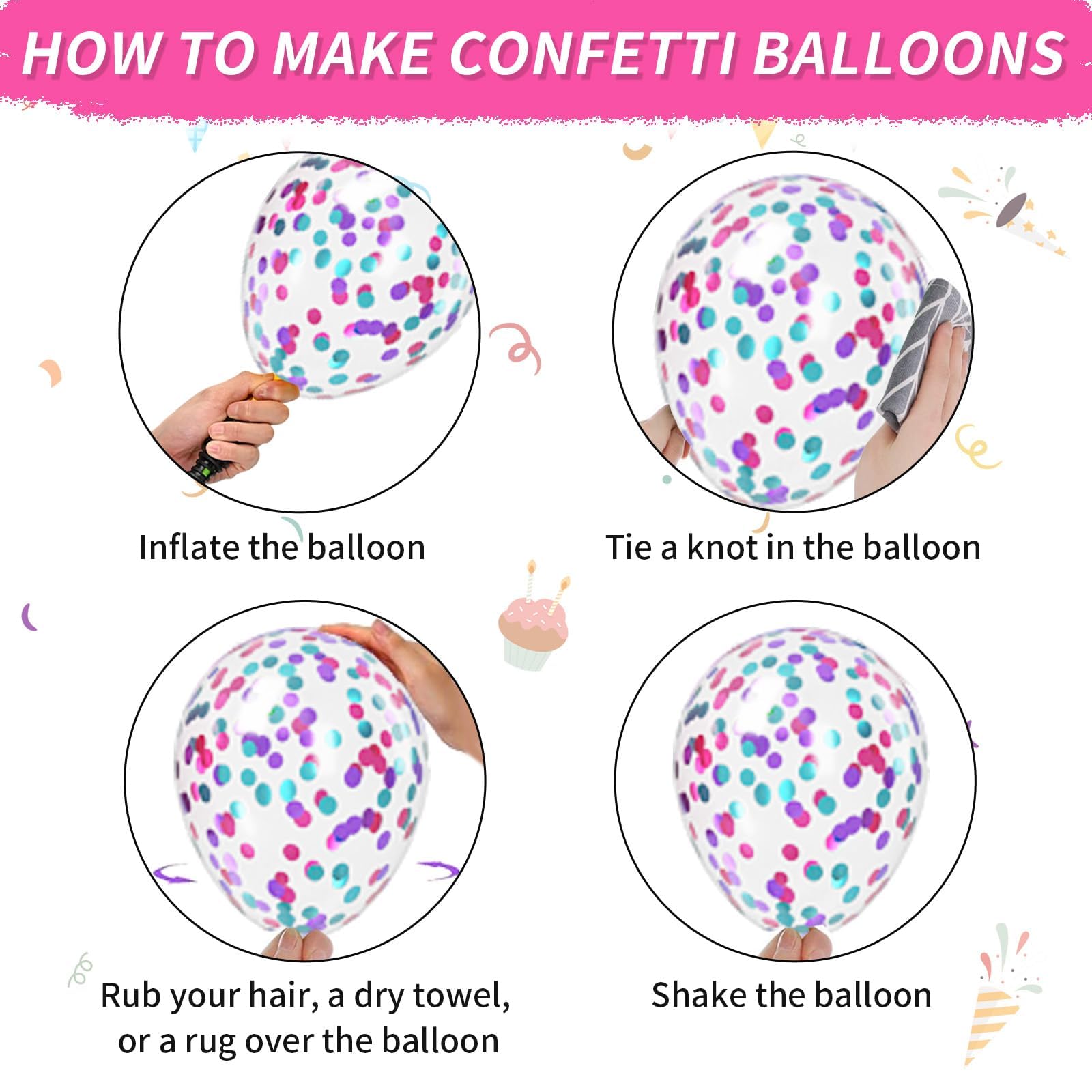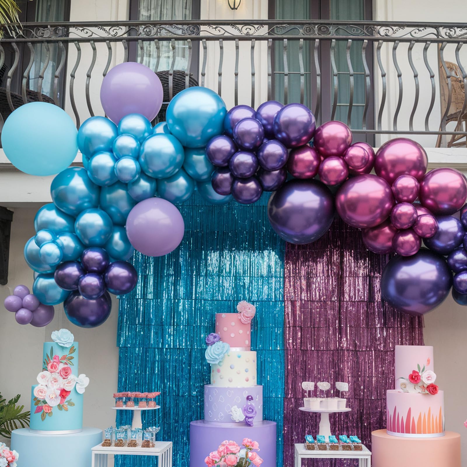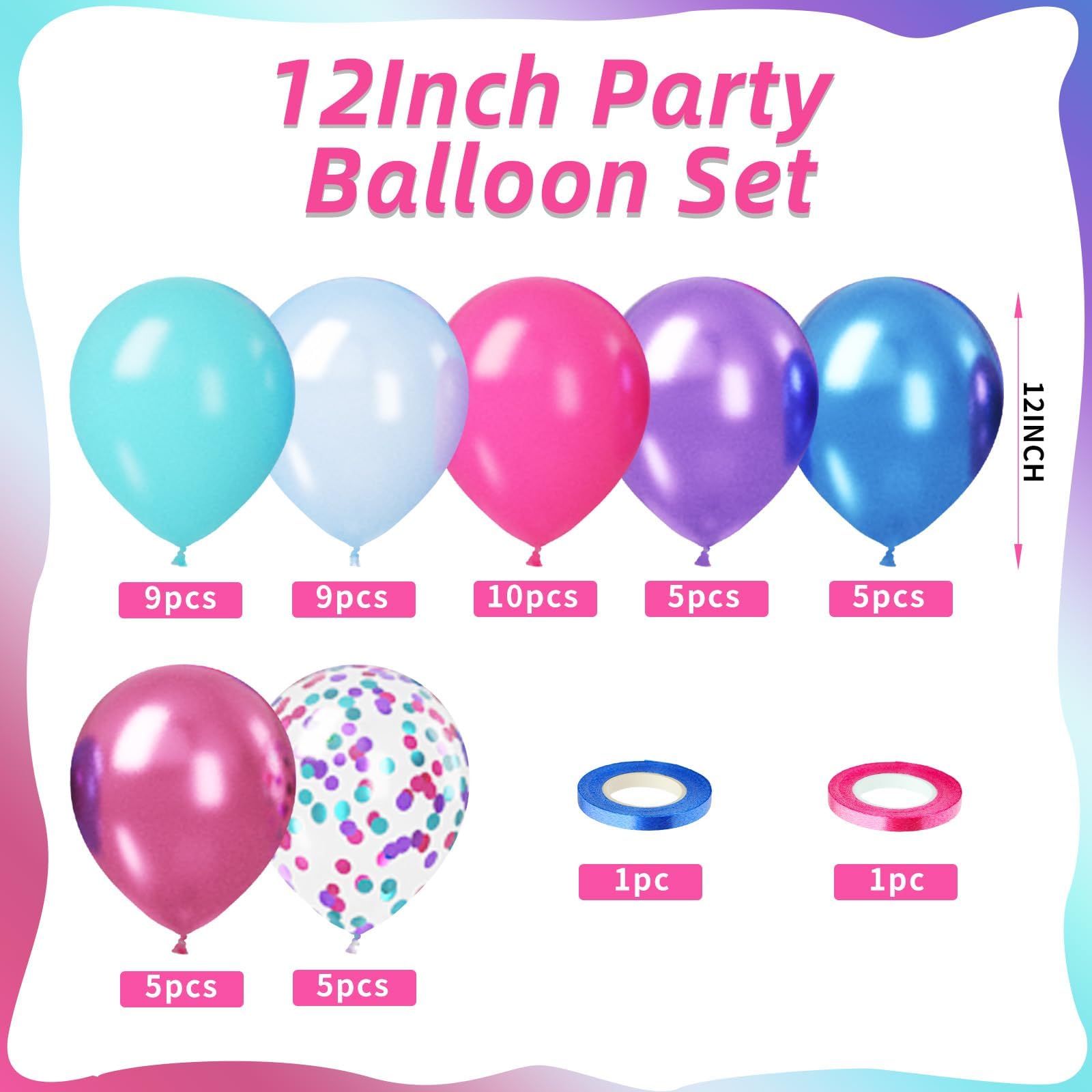 12-inch pink, purple and teal balloons: Package includes 5 metallic blue balloons, 5 metallic purple balloons, 5 metallic pink balloons, 9 teal balloons, 9 purple balloons, 10 hot pink balloons, 5 confetti pink, purple and teal balloons, 2 balloon ribbons