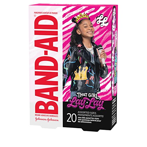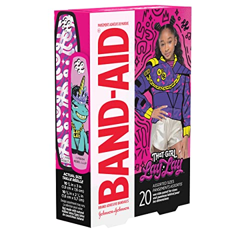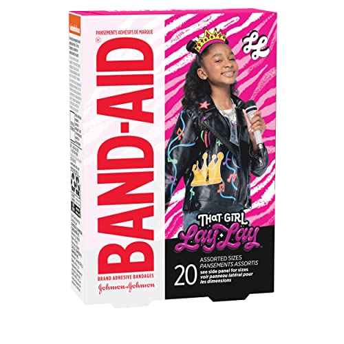 20 count box of decorative Nickelodeon That Girl Lay Lay Band-Aid Brand Adhesive Bandages for kids to cover and protect minor cuts and scrapes to deliver daily wound care protection and perfect for your family's first aid kit