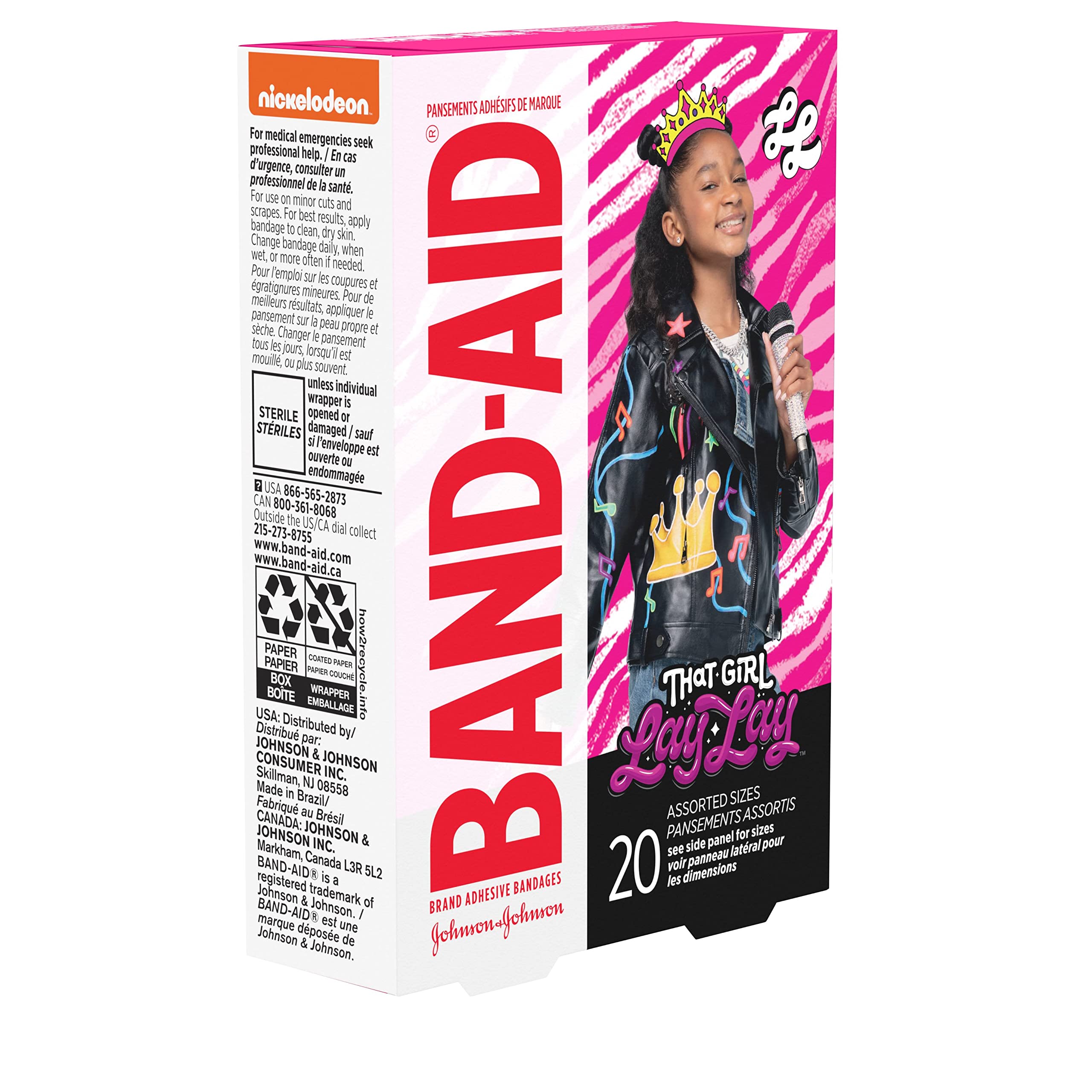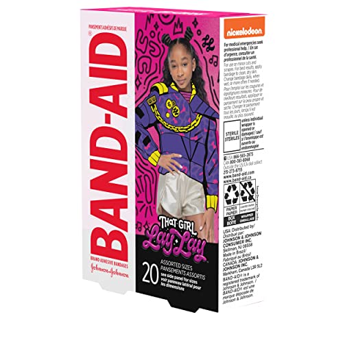 Care for your child's minor cuts and scrapes and bring a smile to their face with Nickelodeon That Girl Lay Lay Band-Aid Brand Adhesive Bandages. These first aid adhesive bandages for kids cover minor cuts and scrapes to deliver daily wound care and healing protection. Perfect for kids, each fun bandages feature colorful Nickelodeon That Girl Lay Lay graphics from the popular tv show to make first aid more fun for your child. As part of your essential first aid supplies, the decorated bandages protect minor wounds from contact with germs and dirt. These sterile kids' bandages come in various sizes and are comfortable to wear thanks to a non-stick pad that won't adhere to the wound. The box contains individually wrapped bandages. For best results, apply bandage to clean, dry skin. Change daily, when wet, or more often if needed. 2021 Viacom International Inc.