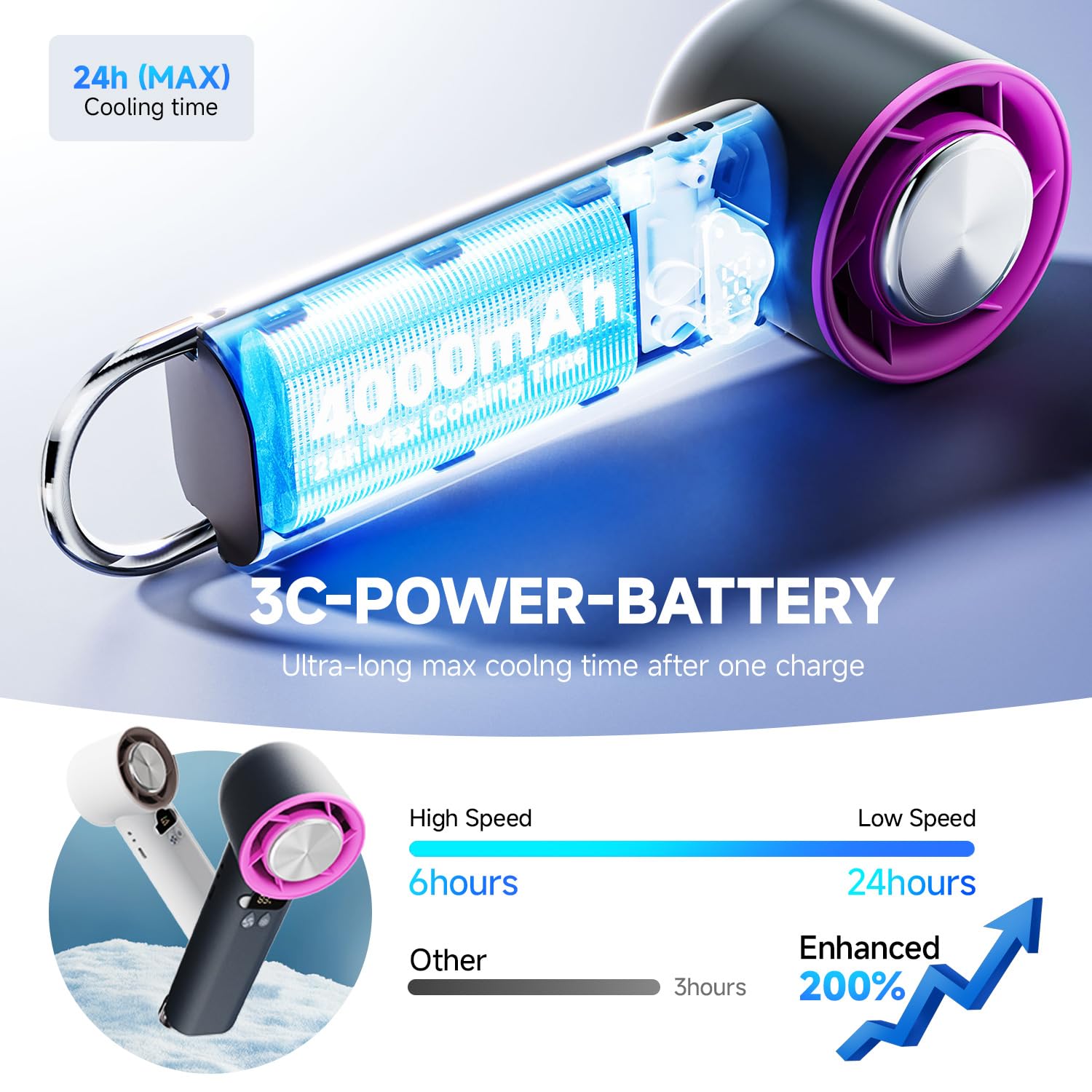 [Ultra-Long Cooling Time] - The combination of brushless motor and a 4000mAh battery. It can cool for 24 hours time on a single charge. Besides, Significantly improves the wind speed, power, and endurance. The highest rotation speed of the handheld fan is 2.5 times that of a regular personal fan, reaching up to 15000 RPM.