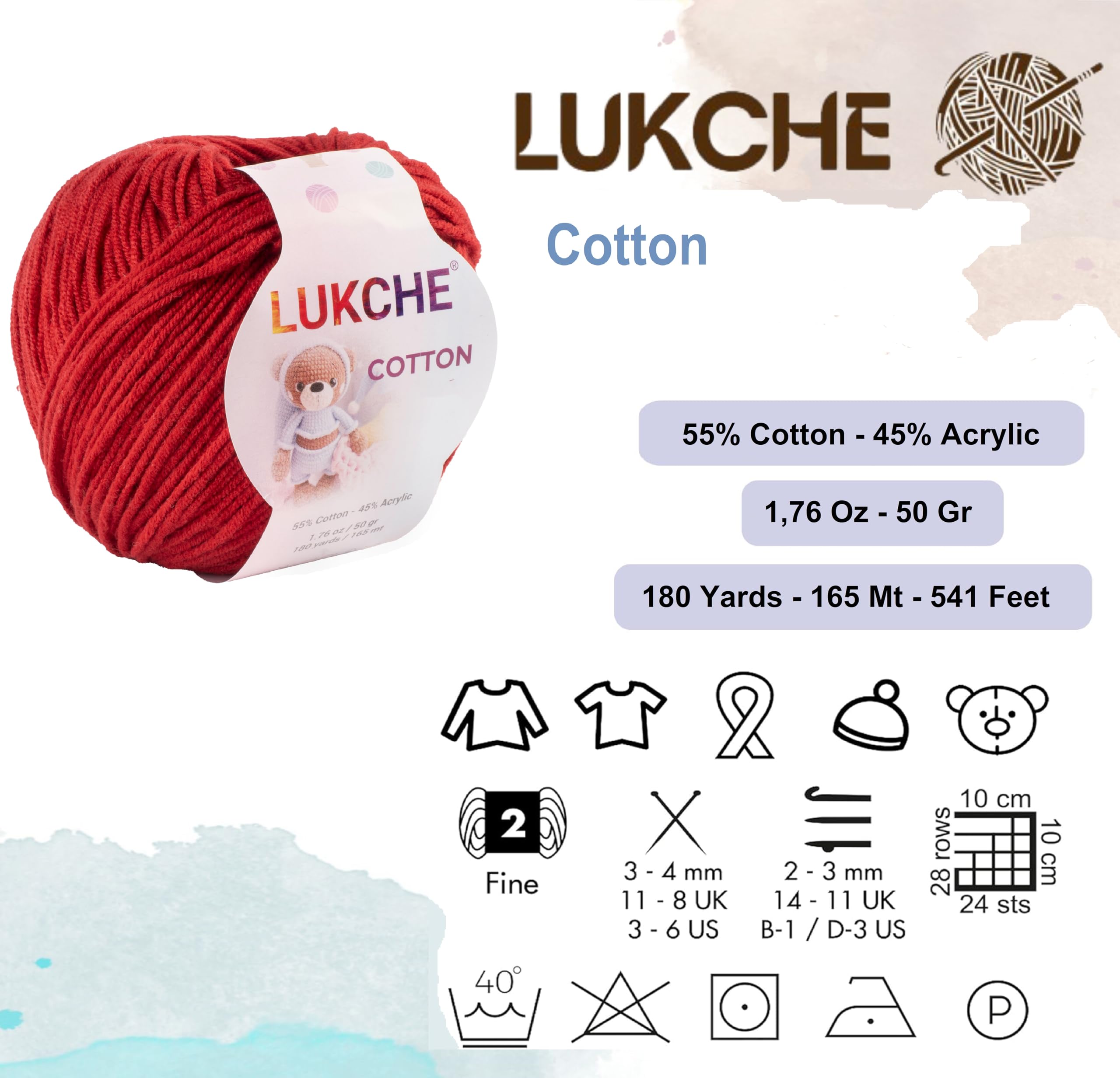 Lukche Cotton Yarn ✔Composition: 55% Cotton – 45% Acrylic ✔Weight: 50 gr (1.76 Oz) ✔Length: 165 m (180 yds) ✔Recommended needles: 2-3 mm (US B-1-D-3) ✔Recommended crochet hooks: 3-4 mm (US 3-6) ✔Yarn Weight: Sport – Fine (2) ✔Lukche Cotton is one of the most preferred yarns by all artisans with its wide color range that offers pastel and vibrant colors together. ✔Thanks to its texture and cotton content, it is suitable for all baby clothing and amigurumi. ✔Denim has a smooth structure that you can knit perfect summer products. ✔It is also preferred for punch embroidery. ✔There may be some differences in color tones due to your monitor settings. ✔ Lukche Cotton yarns are perfect for amigurumi dolls and animals, small bags for young girls, gradient cardigans, baby blankets, shawls, rattle baby toys, crochet motifs. ✔ Yarn colors are very diverse and beautiful, Yarn has a soft texture. If you have any questions, please feel free to ask us via message. Attention: ⚠ Machine wash (up to 86 F) ⚠ Do not tumble dry ⚠ Iron (Low Temperature) ⚠ Do not bleach