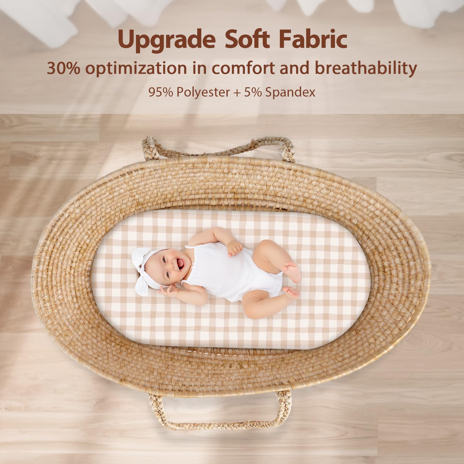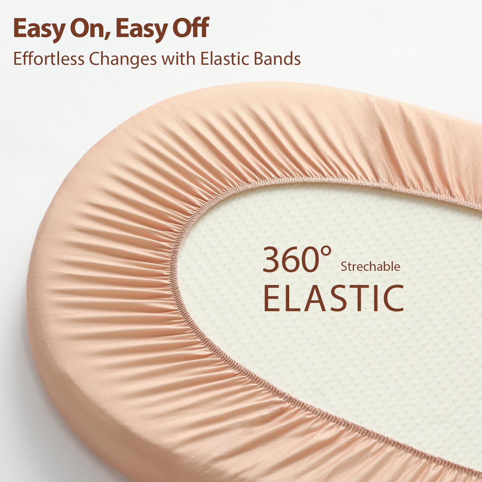 Effortless Installation: With 4-way elastic design around the edge, these bassinet sheet easy to put on and off your crib mattress. The stretchy and durable band keeps the baby sheets for bassinet securely in place, perfect fitting without any loosening or slipping away, so moms can avoid frequently adjusting crib mattress sheet and promote parental joy and simplify parenting.