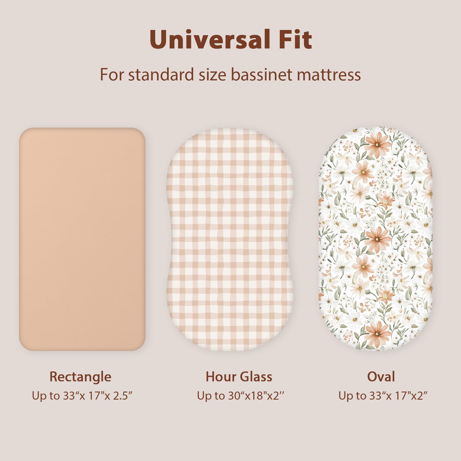 Perfect Size: Measured 32"x16", universal bassinet sheets snugly fit for most popular mattresses, such as standard oval, round, rectangular, and hourglass. 5-Inch pocket provides full coverage and protection for your mattress.