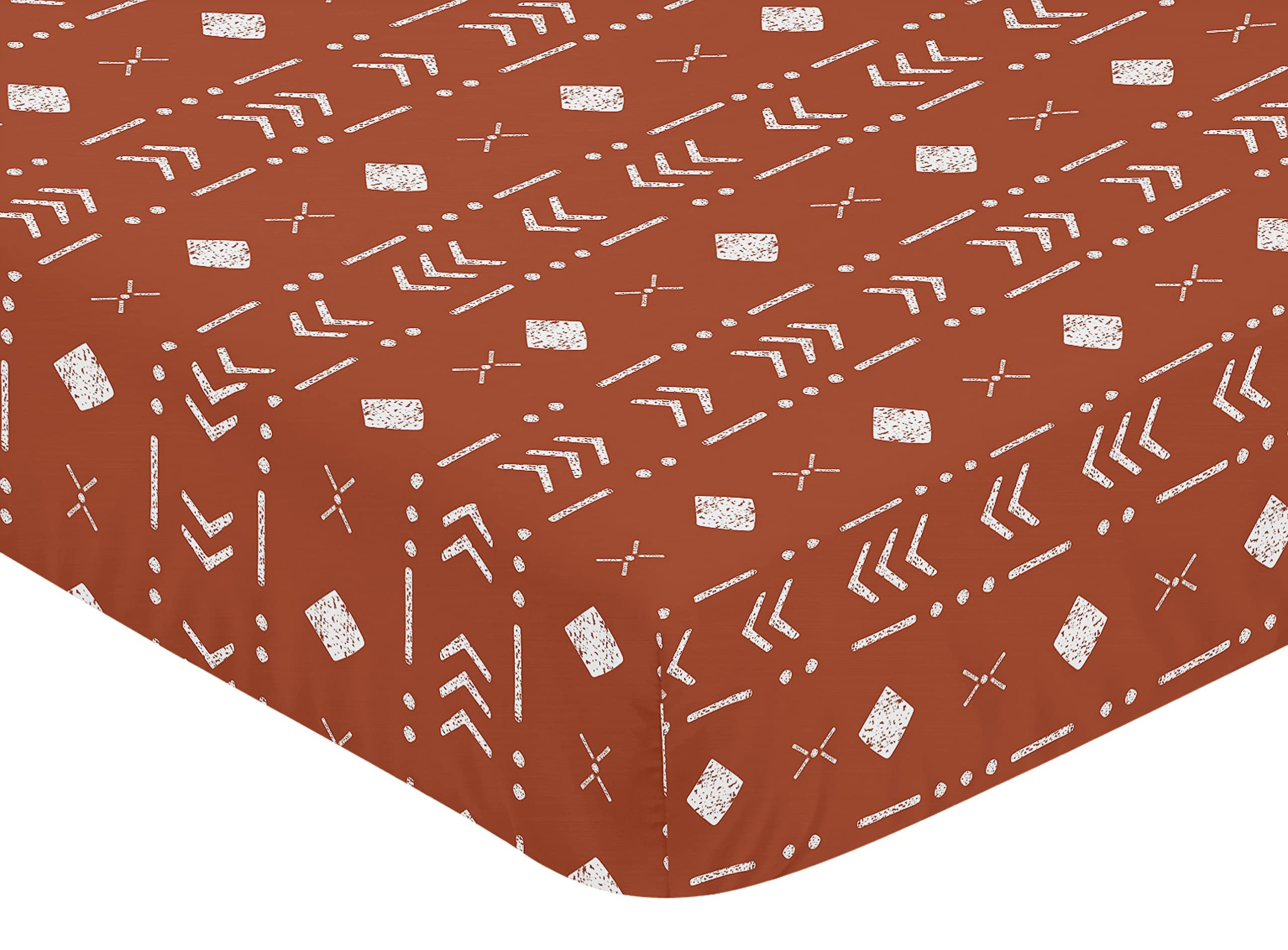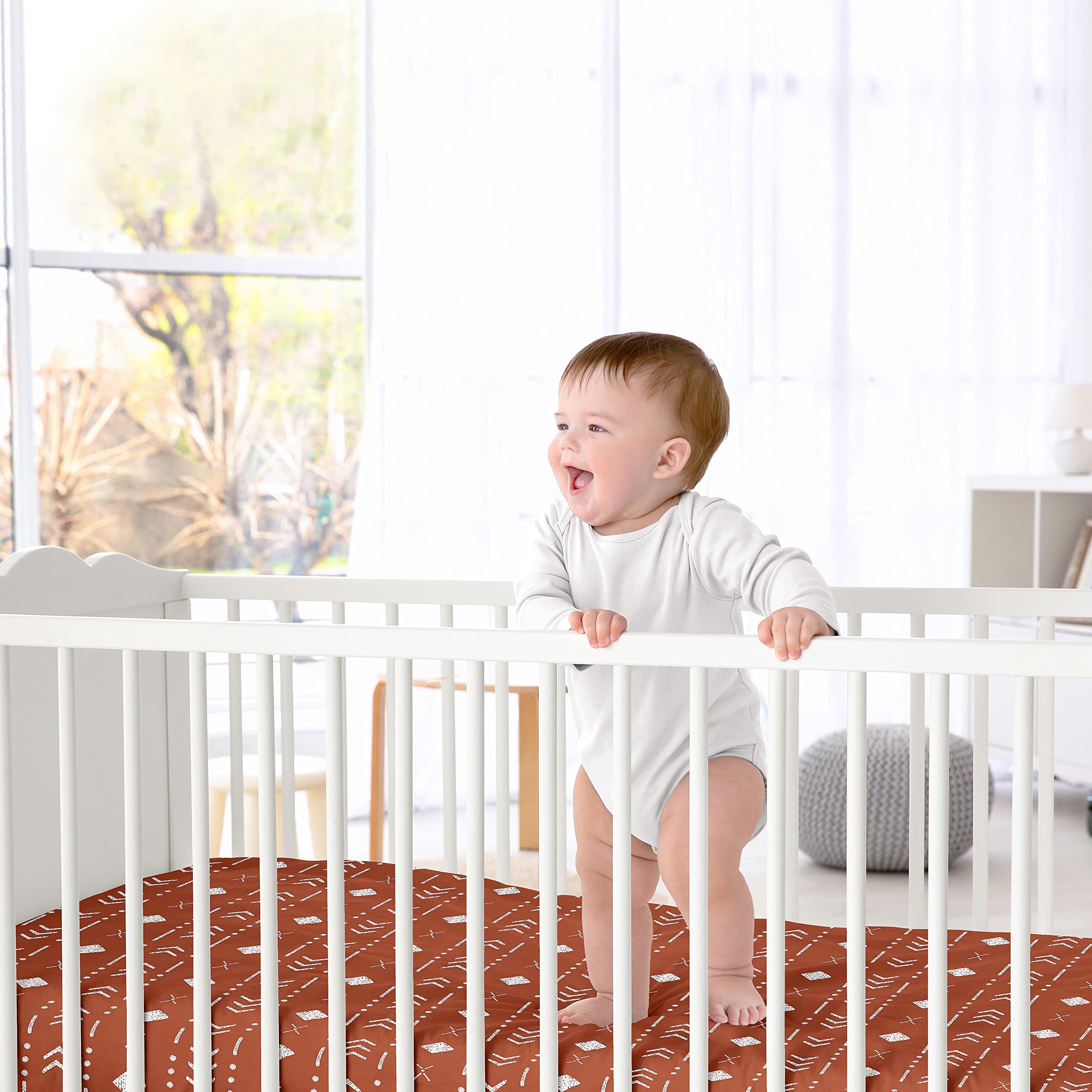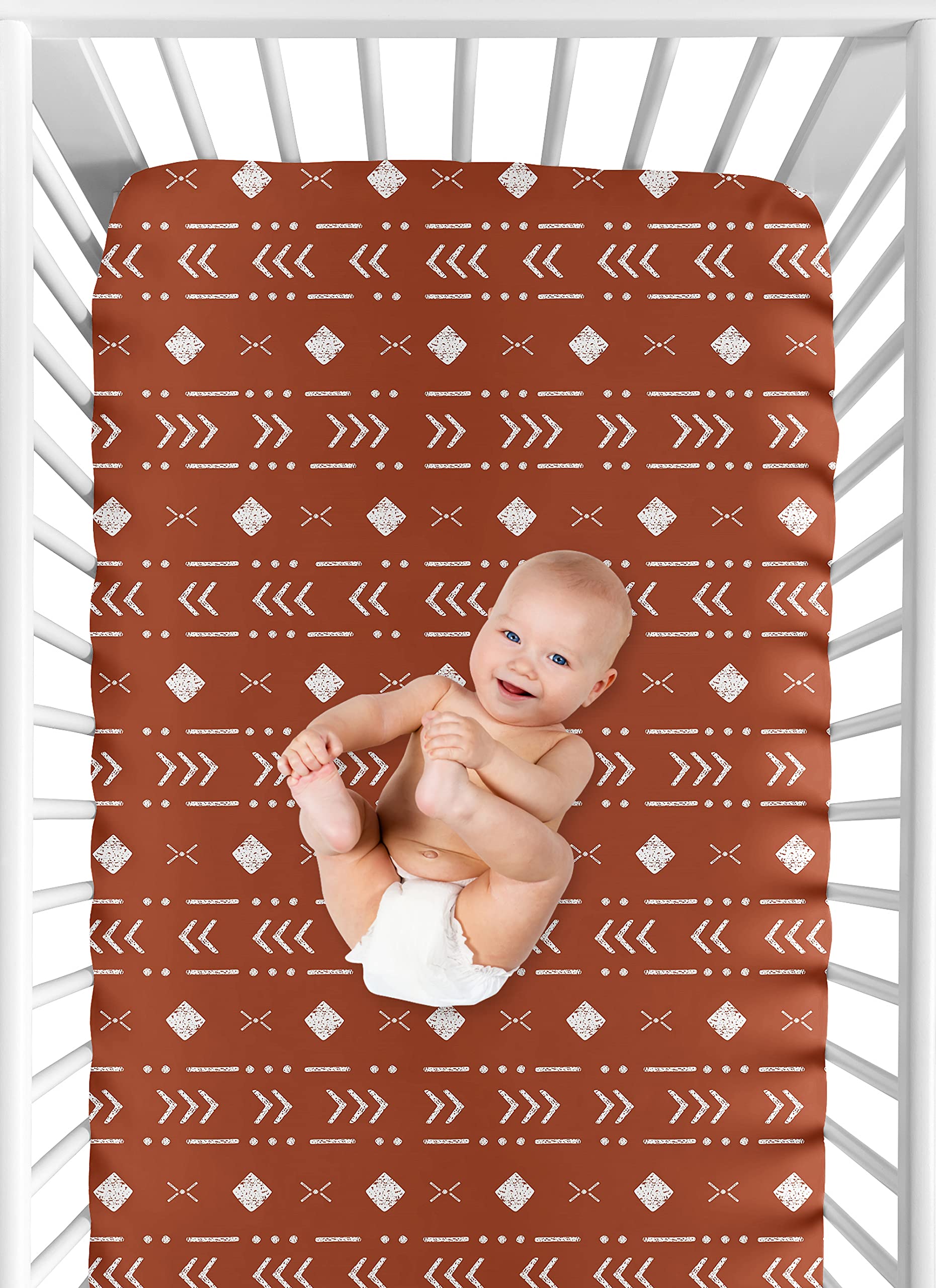 SNUG FIT: Includes (1) Fitted Crib Sheet 52in. x 28in. x 8in. Our newborn standard crib sheets fit snugly, with premium elastic sewn around the entire bottom edge for a secure fit on most standard sized cribs and toddler beds, to reduce shifting & bunching. This brushed microfiber crib sheet features an exclusive design of a rust orange and white woodland, bohemian, southwest, geometric, aztec, tribal geo, arrow mudcloth print & is gentle on delicate skin to foster a soothing sleep environment.
