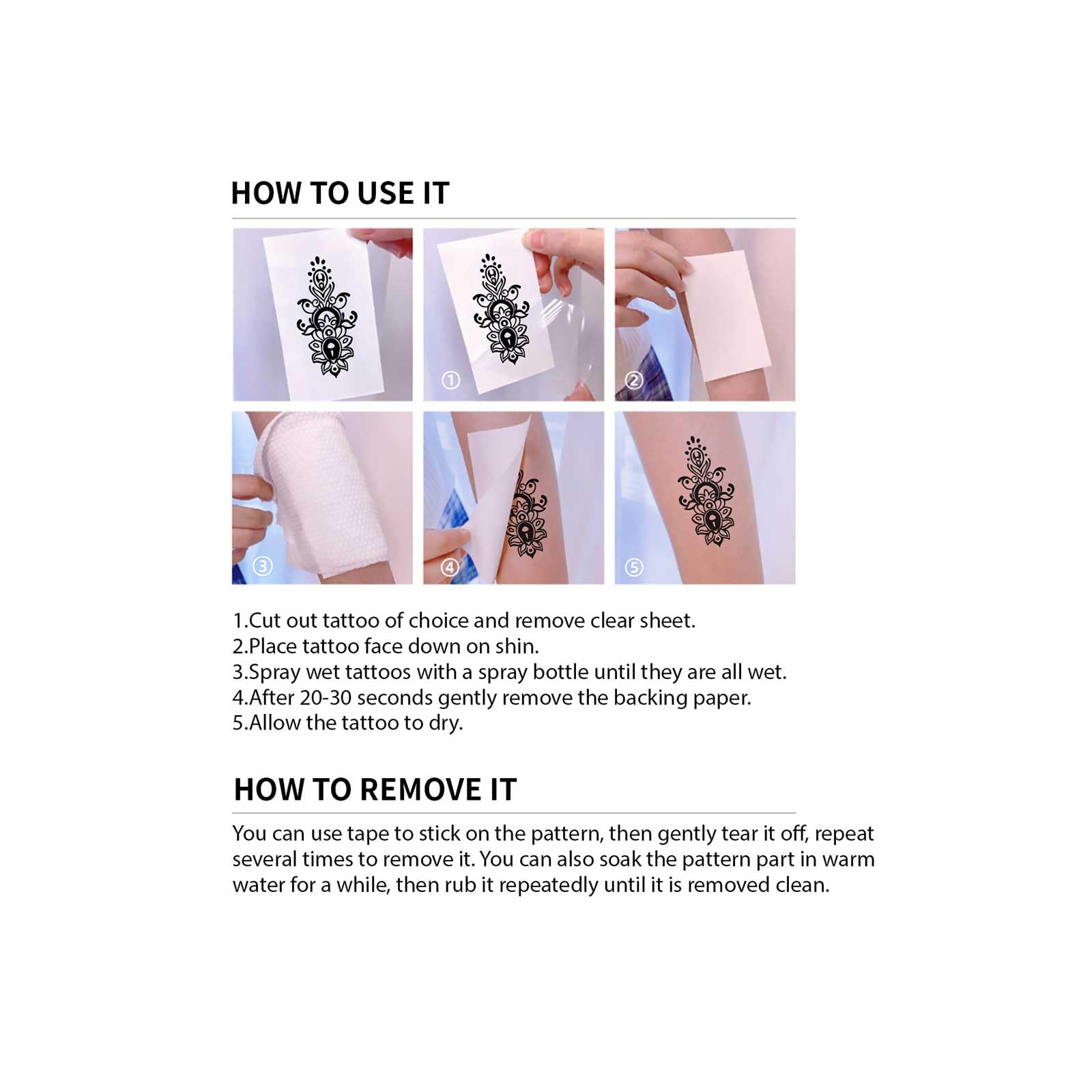 ✿【Easy to Use】: Our henna tattoo is very easy to use, just need to pick one sheet you like and stick it on your skin face down, wet it with water, and gently press it for a few times. Transferred correctly can make the tattoo last longer. Lace temporary tattoos are clear, waterproof and can last for days. It can be used within 10-20 seconds, just wipe with water, and wash off with alcohol, body oil, and olive oil.