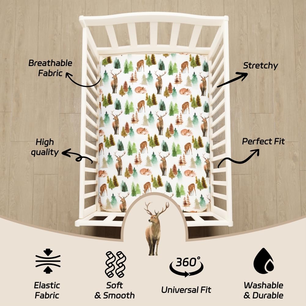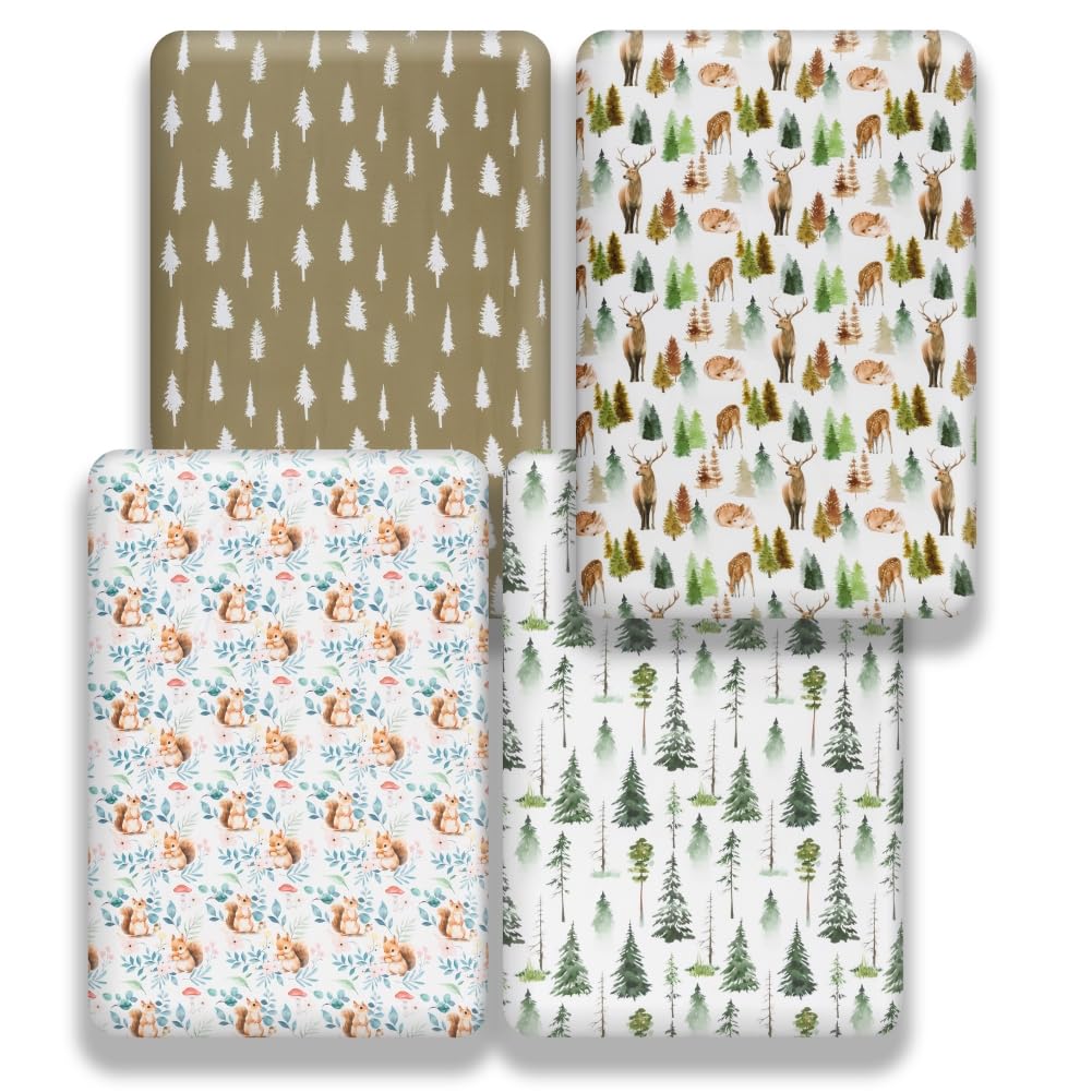 4 PACK VALUED SET: The woodland themed crib sheets set included 4 pack baby crib sheets with different colors and designs. You will have enough cribs sheets to replaces once one even two or three during washing, perfect for any nursery, for boys or girls! Buying 4 different kinds of crib sheets as a set than buying them one by one will save your money and time