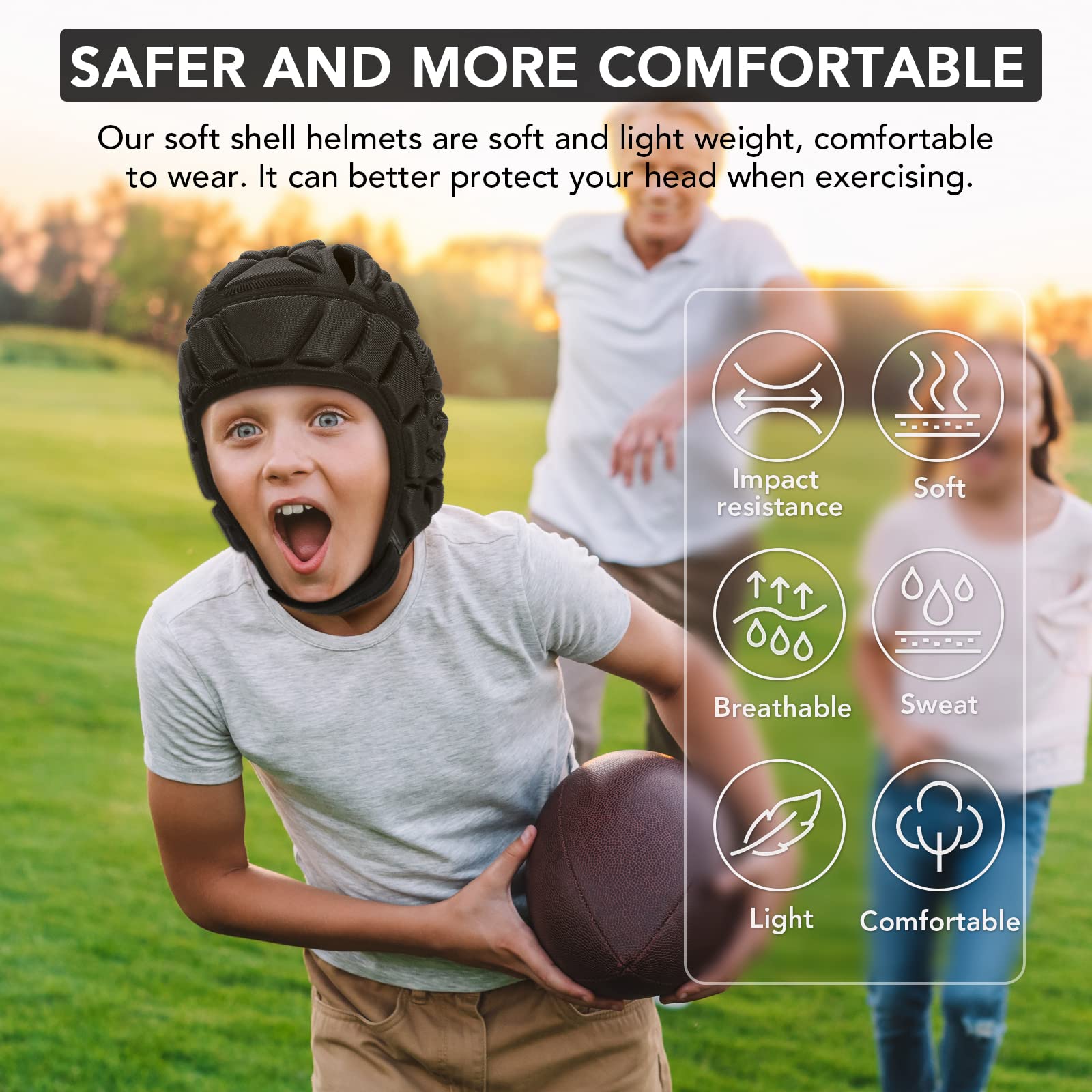 1. Comfortable Soft Shell Football Helmet -- Designed for flag football and 7 on 7 football games.This lightweight flag football helmet youth features an ergonomic soft shell helmet design that provides excellent comfort and flexibility. The upgraded structure makes it an ideal soft helmet for flag football and 7v7 football games.