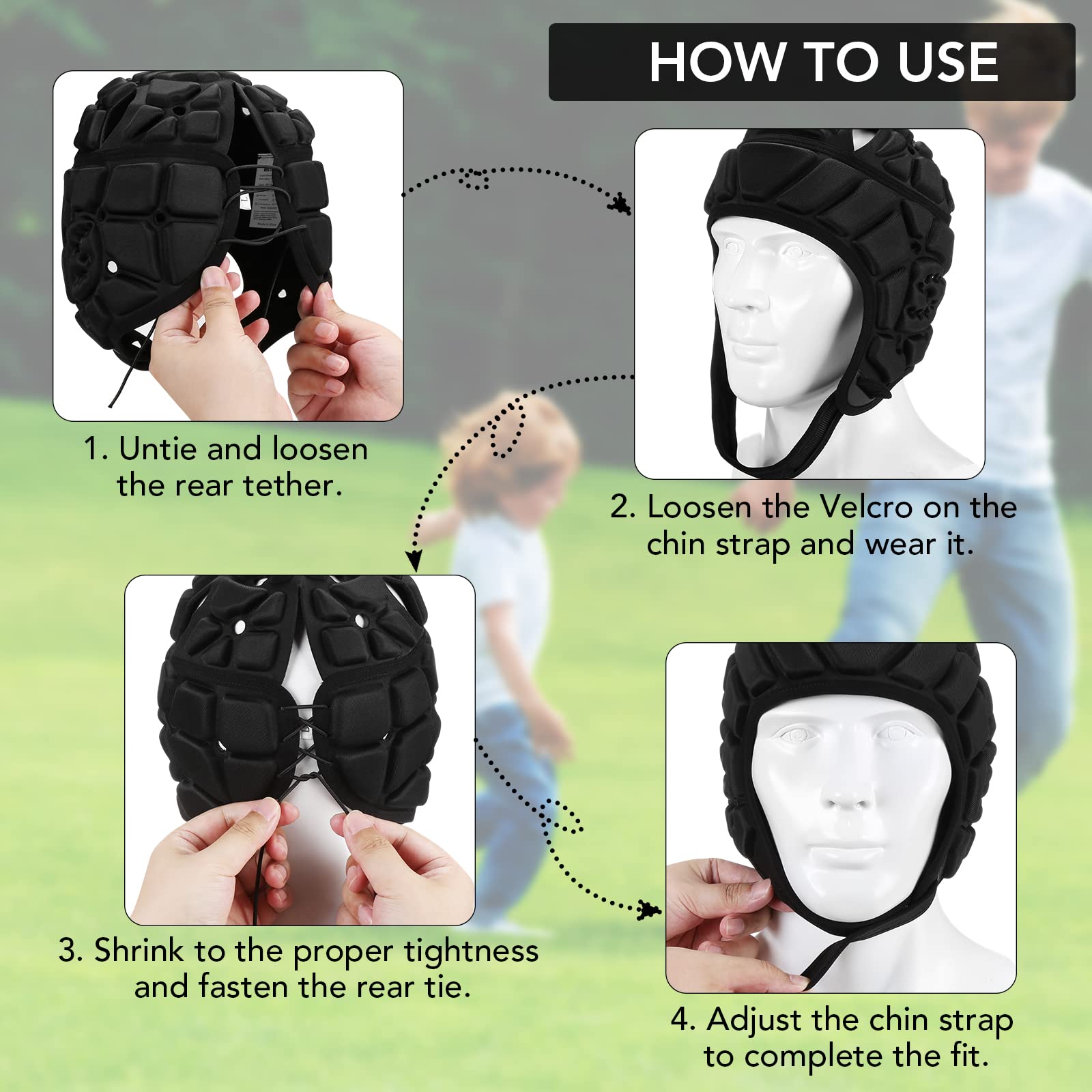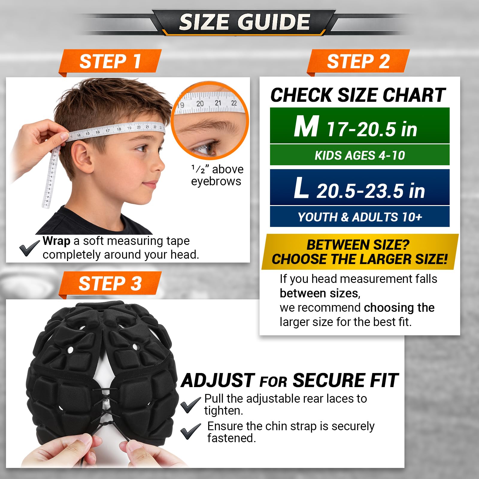 5. Flag Football Helmet Size Guide -- M: 17–20.5 in Recommended for kids ages 4–10 L: 20.5–23.5 in Recommended for youth & adults ages 10+ If between sizes, choose the larger size. Adjustable rear laces and chin strap ensure a secure fit for both kids football helmet and youth football helmet players.