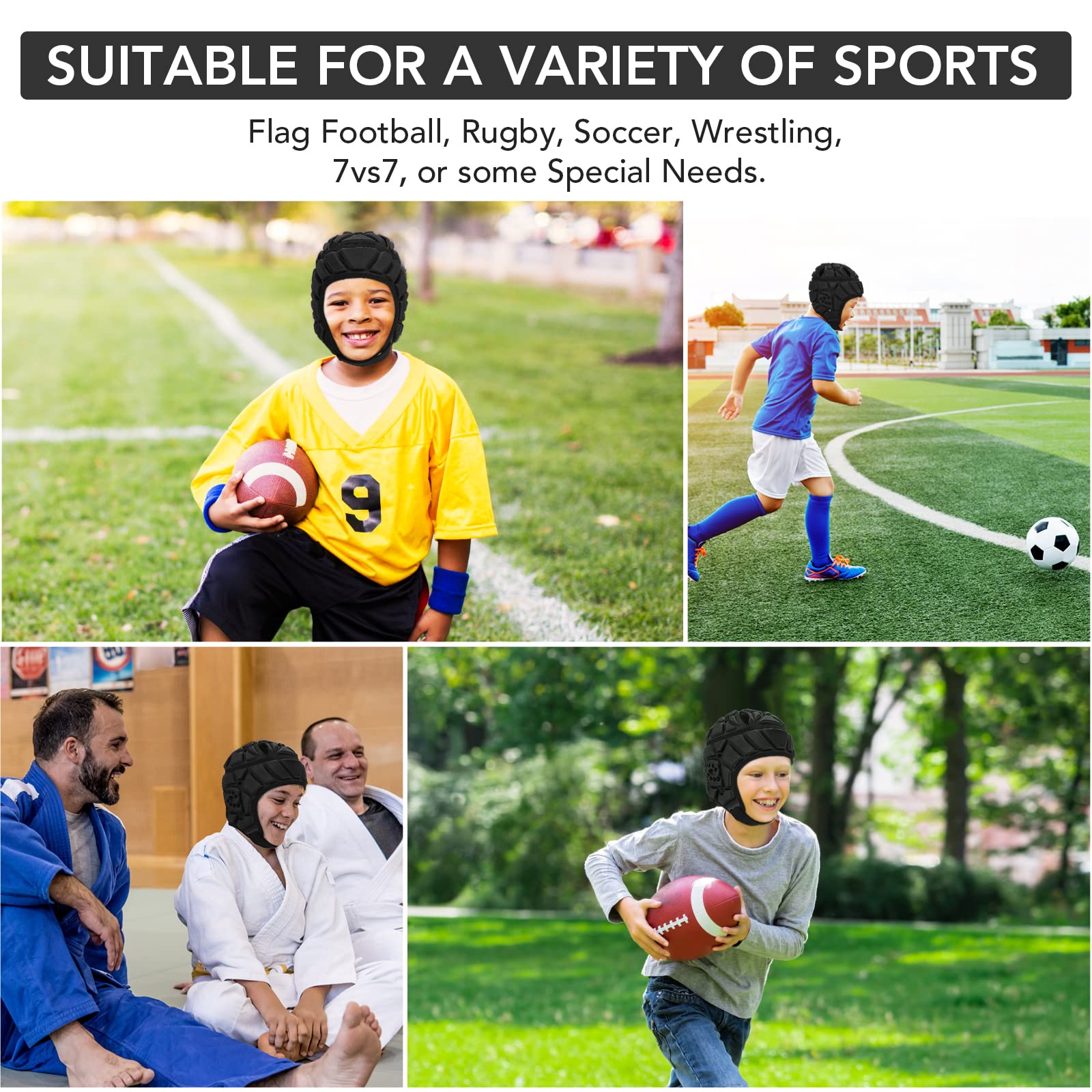4. Multi-Sport Protective Headgear -- This soft shell helmet works as flag football helmet youth, rugby scrum cap, soccer goalie headgear, wrestling headgear, lacrosse head protection, and other contact sports equipment.