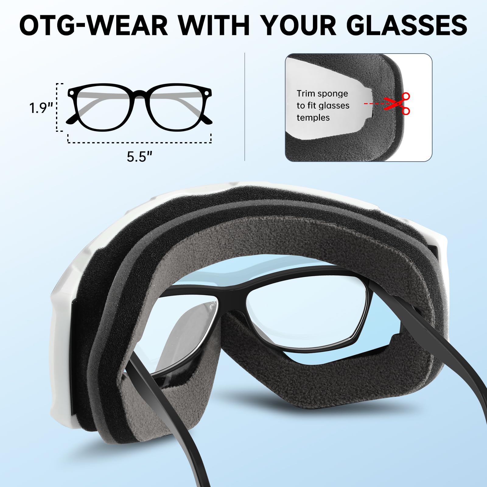 【Oversized OTG (above the glasses) design】-With the OTG (above the glasses) design, the Skiing glasses allow you to wear the glasses under the goggles, and the goggles are also suitable for those who wear glasses. It is perfect for skiing, skiing, snowboarding, ice skating, rock climbing, motorcycling/mountain riding, aerial driving, bungee jumping and more.