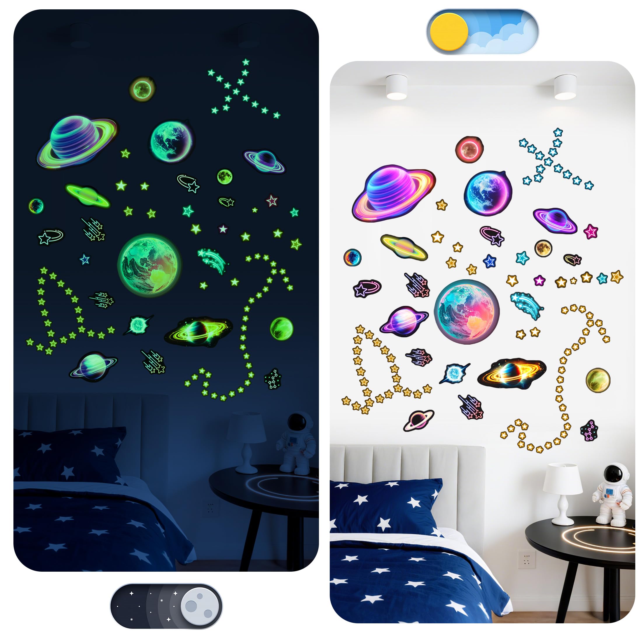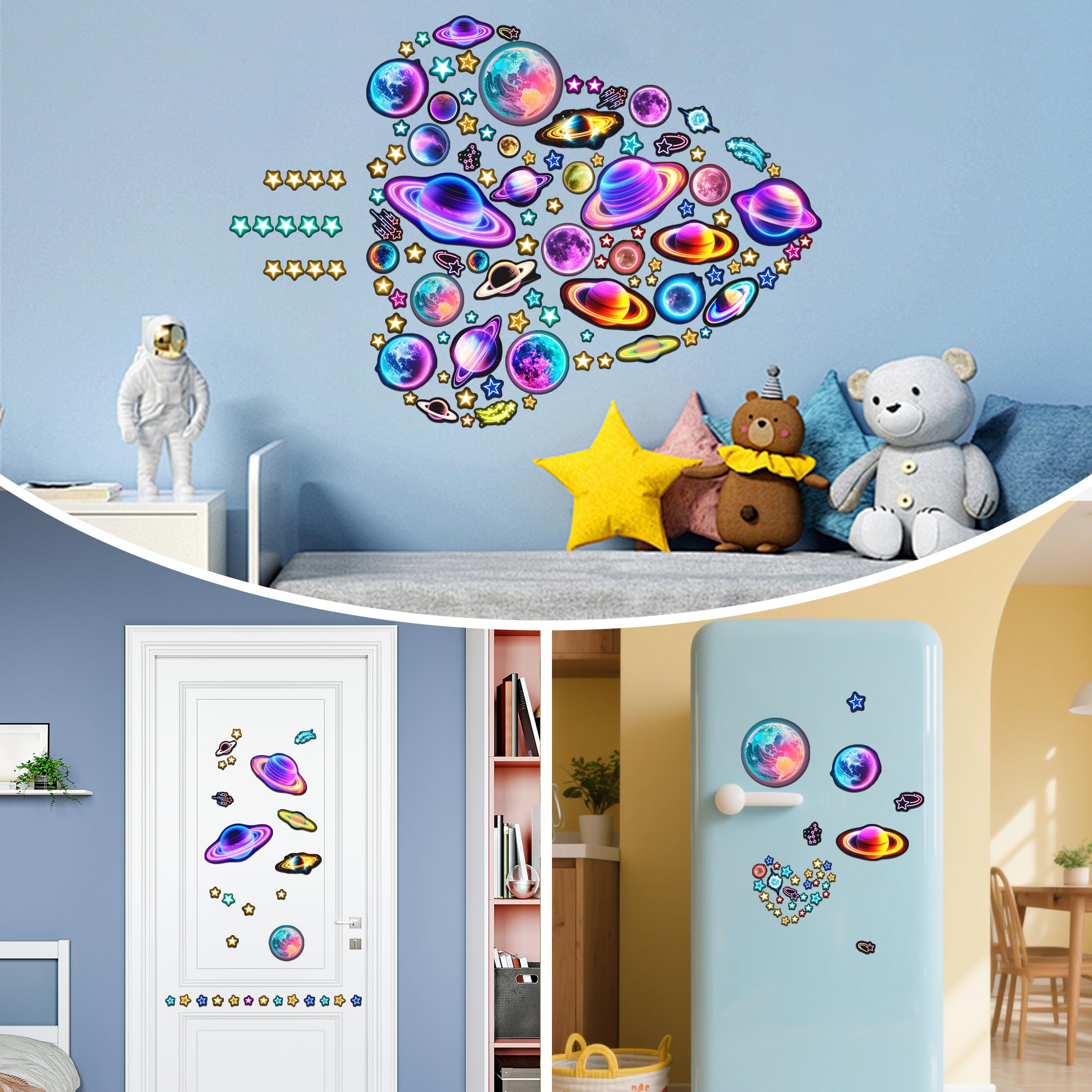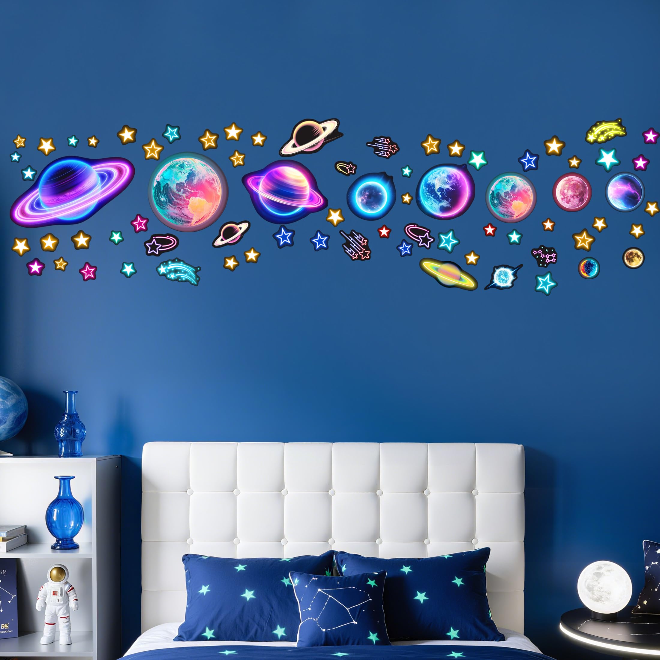 【PACKAGE INCLUDED】You will get a set of glowing neon celestial wall sticker set with colorful planets, stars and tiny spots. Decorate the ceiling with charming glow in the dark stars and give your child's room a new look.
