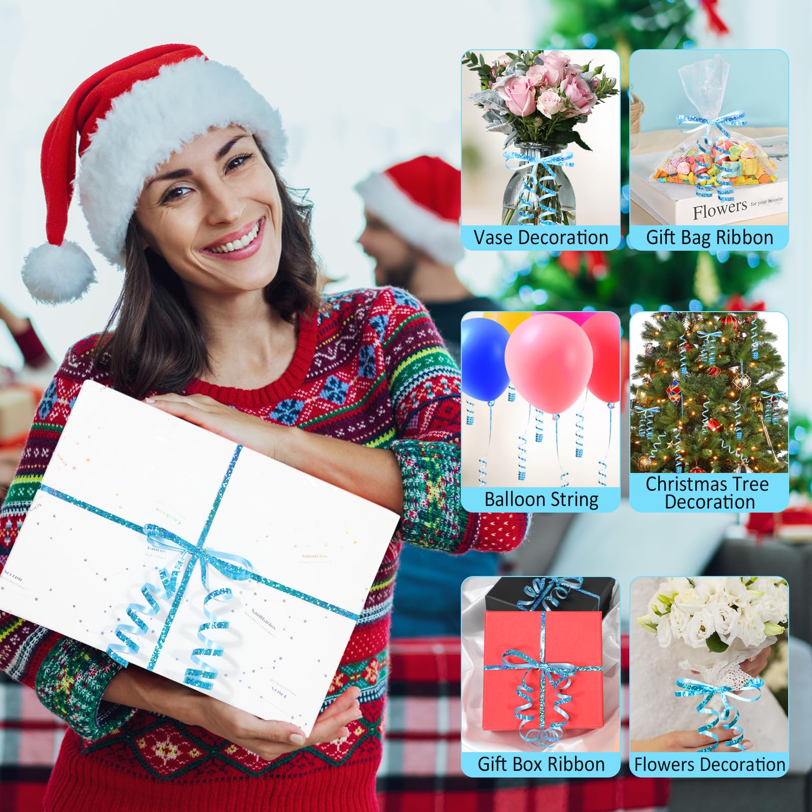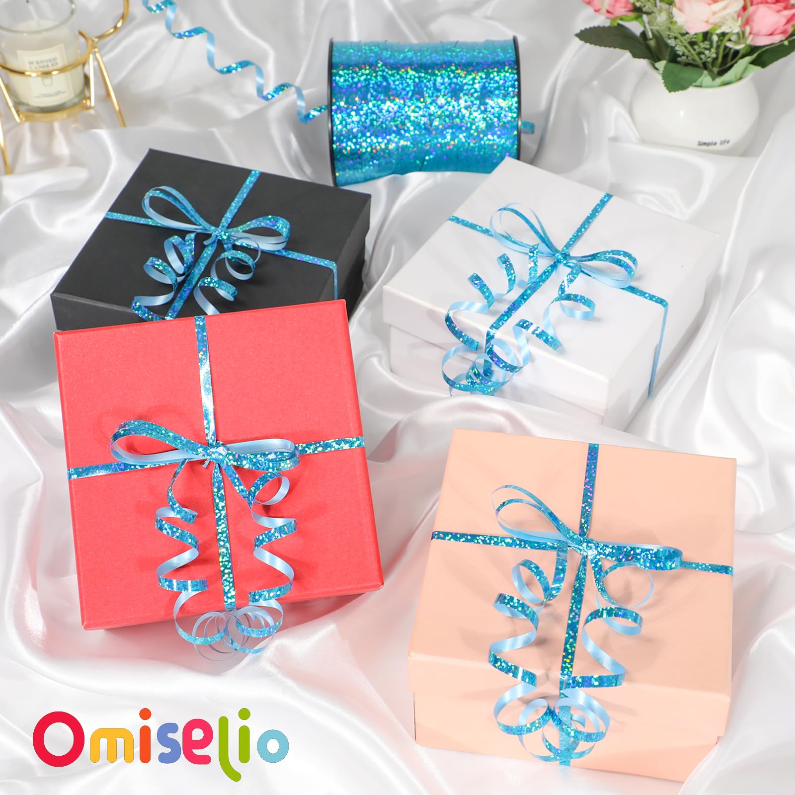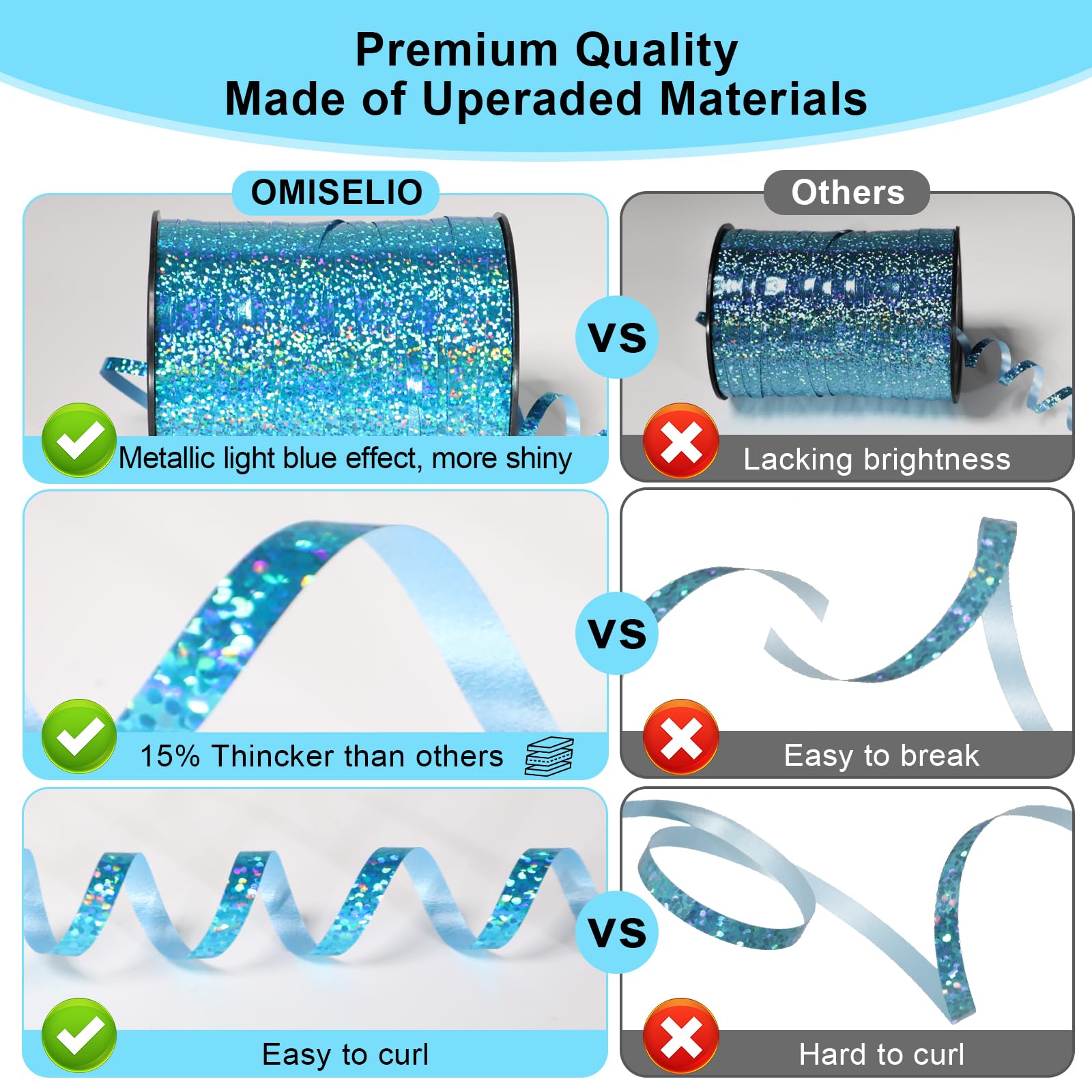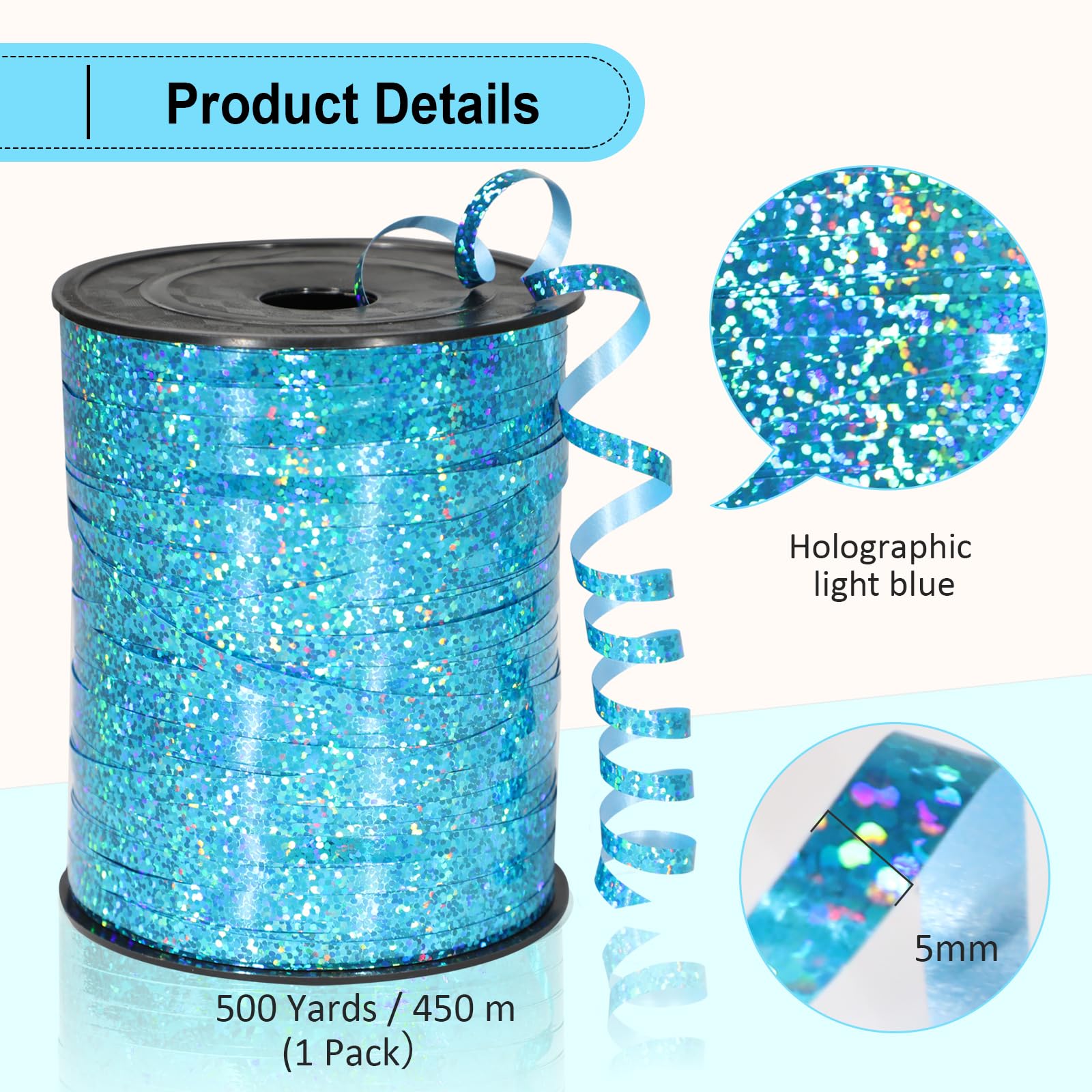 Shiny and Attractive:Metallic holographic light blue curling ribbon with bright and vivid color. The shiny and sparkley blue ribbon will brighten up all your gifts. It adds that special touch to any present