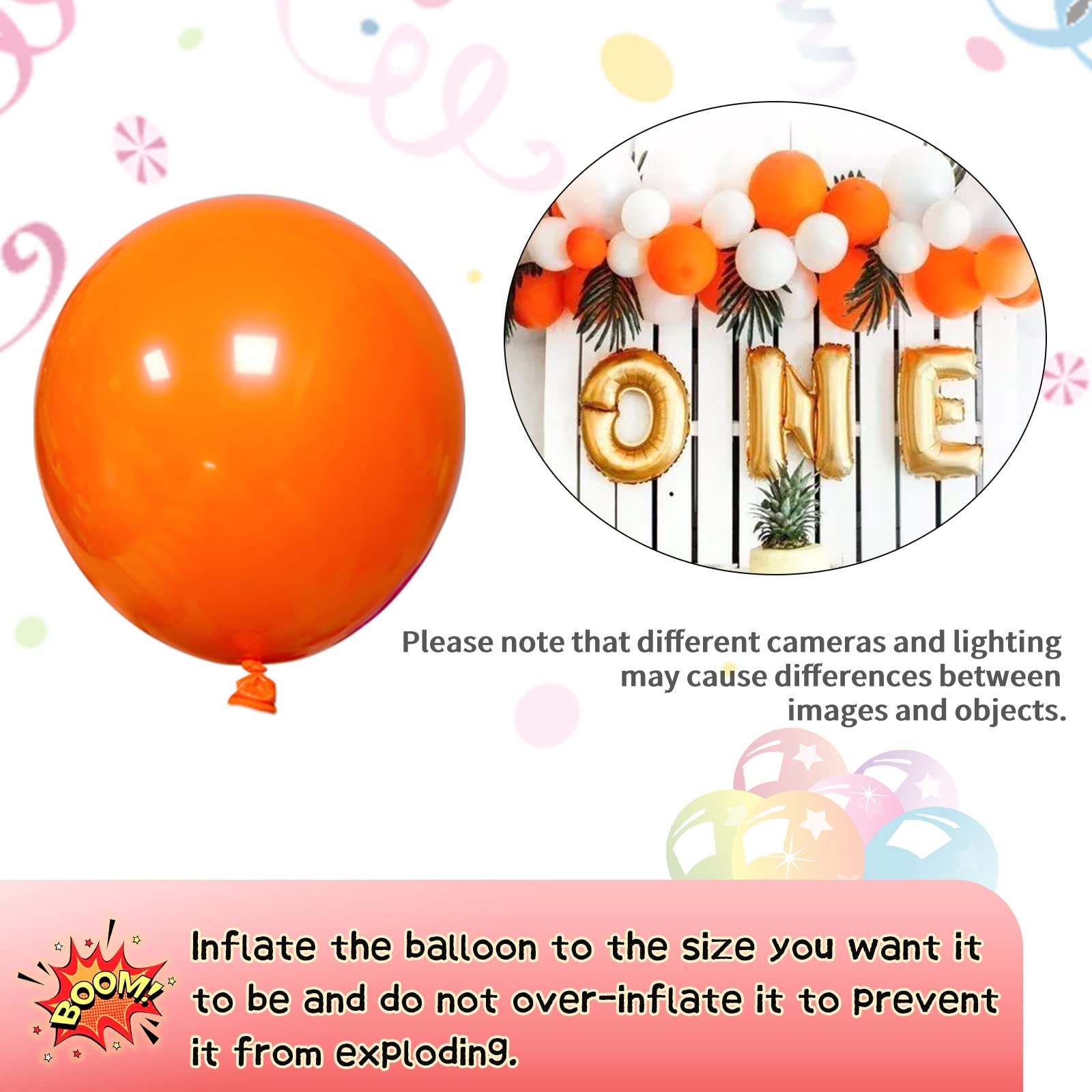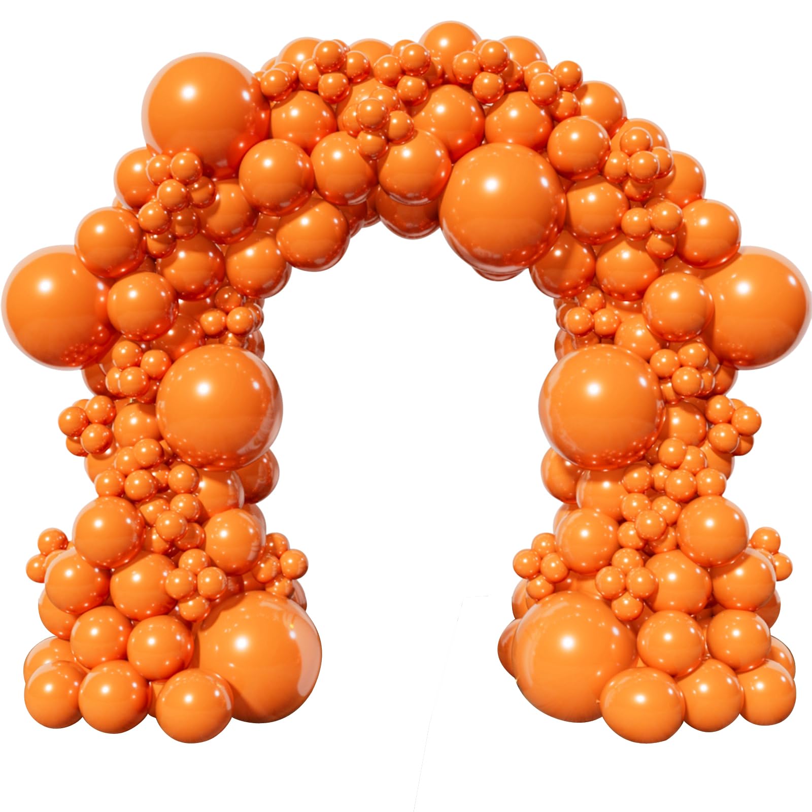 Orange balloon garland kit: 111Pcs Orange balloons pack, including 8 pcs 18 inch balloons, 50 pcs 12 inch balloons, 50 pcs 5 inch balloons, a 5 meter balloon chain, 100 dots of glue dots, a roll of ribbon.