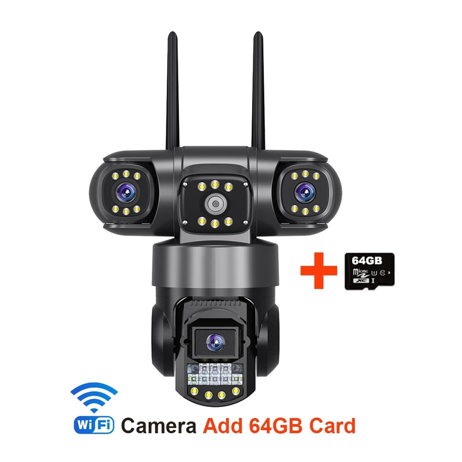 ========== Zoom type: Digital zoom Zoom: 10 times Number of lenses: Three lenses AI function: Motion detection Shell material: Plastic Color night vision: Yes Operating temperature: -10° C to 60° C IP rating: IP66 Power supply mode: Municipal power supply Rechargeable battery: None Scene: Indoor and outdoor Range of movement (tilt) : Others Range of movement (translation) : Others One million pixels: 4 million pixels TF card: None Power supply: Normal Internal storage: 128G Installation methods: wall-mounted, hanging, pole-mounted Colour: Black is_customized: Yes Audio output: Bidirectional audio Minimum illuminance (Lux) : 0.1 Lux Perspective: 80° Video compression format: H.265 Red equidistant (m): 10 meters Dimensions (length × Width × depth) (mm) : WiFi IP camera Power supply (V): 12V Alarm action: Local alarm Features: Waterproof/weatherproof Sensor: CMOS Lens (mm) : 4mm Connection: WIFI (2.4GHz) High definition: 12 million pixels Style: Box camera Smart Home Platform: Others Power supply: Mains electricity APP: V380 Pro Resolution: A total of 12MP for the three lenses The camera in the upper left corner: 4MP resolution Left and right lenses: 4MP resolution Bottom camera: 4MP resolution Pan-tilt: Horizontal rotation: 355°, vertical rotation: 90° Network connection: 2.4Ghz WiFi, AP hotspot, RJ45 network port Night vision: The IR-CUT switch is automatic, approximately 5-10 meters Audio: Supports two-way audio Alarm: Motion detection and image push Feature 1: Outdoor camera wifi waterproof Feature 2: Wi-Fi camera wireless Function 3: V380 Digital Camera Feature Four: Closed-circuit Television security camera Function 5: Night vision video surveillance Feature 6:WIFI Security Protection Function 7: Camera wifi zewnetrzna Function 8:12MP 6K triple-lens c