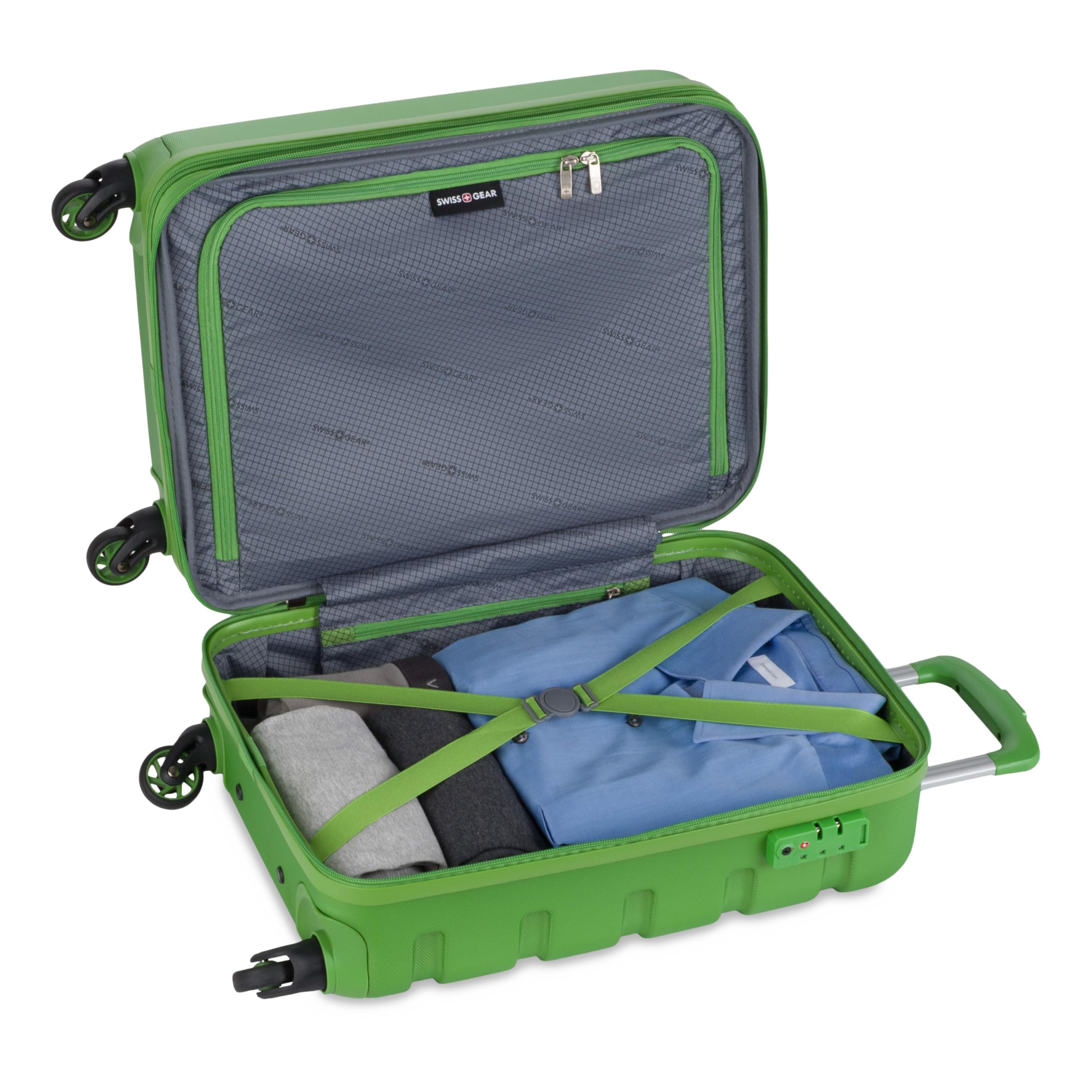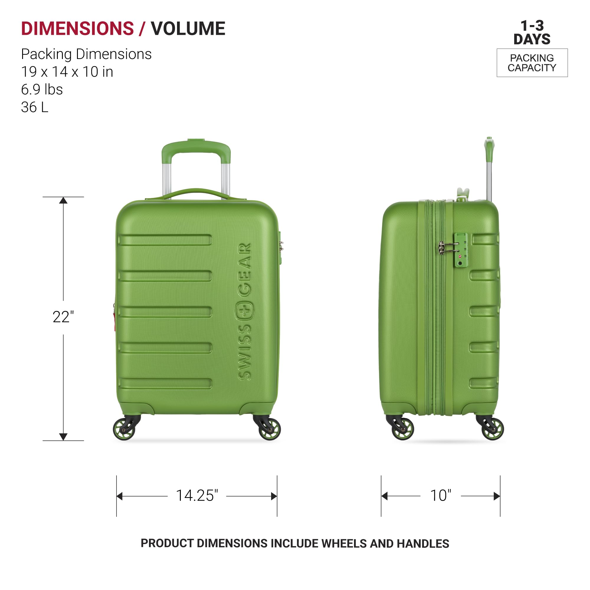 Description Experience ultimate convenience with the SwissGear Signature Hardside Expandable Carry-On with Cup Holder. Designed for frequent travelers, this 19-inch carry-on is made from durable ABS to withstand the wear and tear of travel. It features a split-case expandable design to maximize packing space while keeping belongings organized with multiple internal pockets. Equipped with eight 360-degree multi-directional spinner wheels and a push-button steel locking telescopic handle, this suitcase glides effortlessly through crowded airports. A unique built-in cup holder adds an extra level of convenience, allowing you to keep your beverage within reach while on the move. With outside dimensions of 22" x 14.25" x 10" and 19" x 14" x 10" of packing space, this compact yet spacious carry-on is ideal for short trips. Plus, it includes a 10-year warranty for peace of mind.