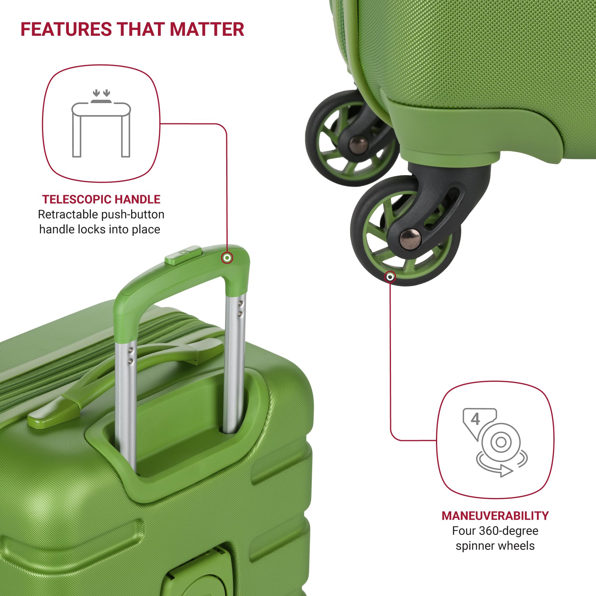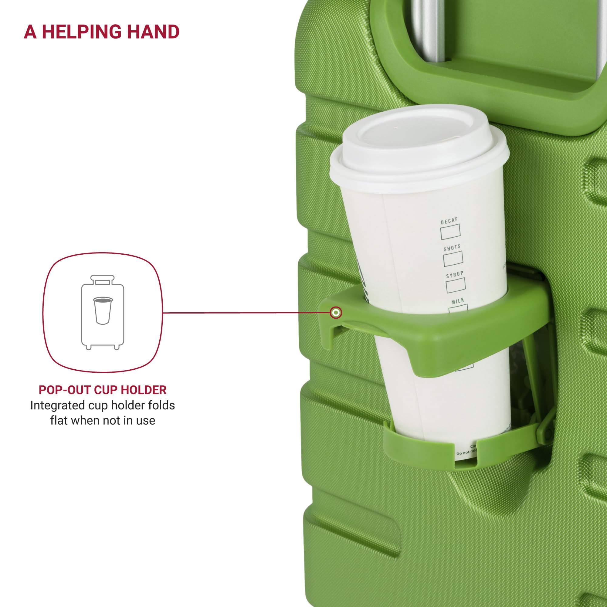 Four 360-Degree Multi-Directional Spinner Wheels: Designed for effortless maneuverability, allowing you to glide through busy airports and tight spaces with ease. Plus, the unique, patented built-in cup holder provides an extra helping hand on the go.