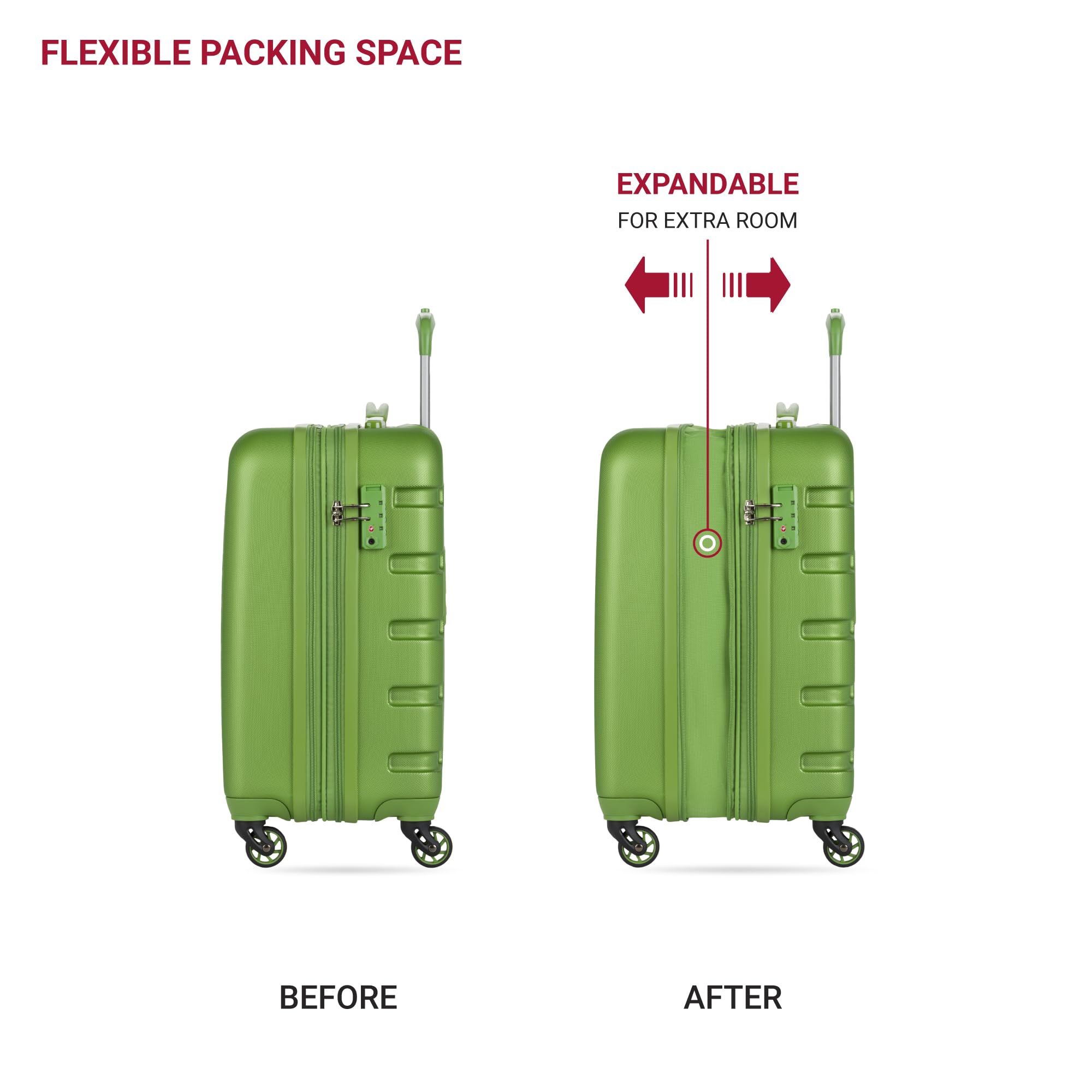 Expandable Carry-On Luggage: Offering 19" x 14" x 10" of packing space, this compact rolling suitcase is perfect for any trip. Designed for convenience, it features a fold-out cup holder and an overall size of just 22" x 14.25" x 10", providing ample storage without unnecessary bulk.