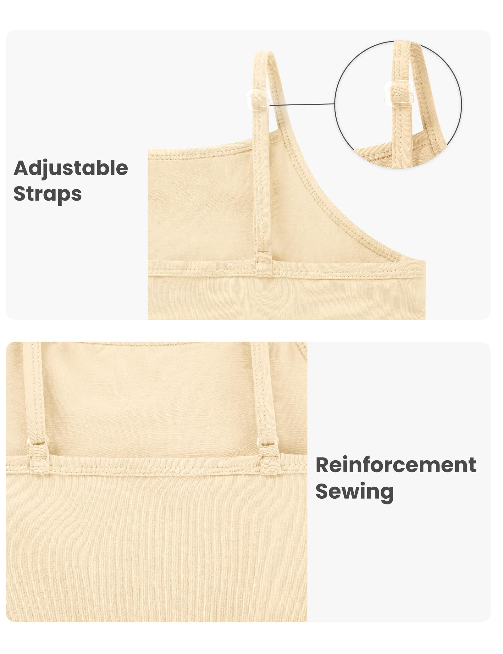 Adjustable Straps: Girls undershirts are designed with spaghetti shoulder strap and double-layer reinforcement design, and the adjustment buckle can be adjusted to fit the skin without slip off