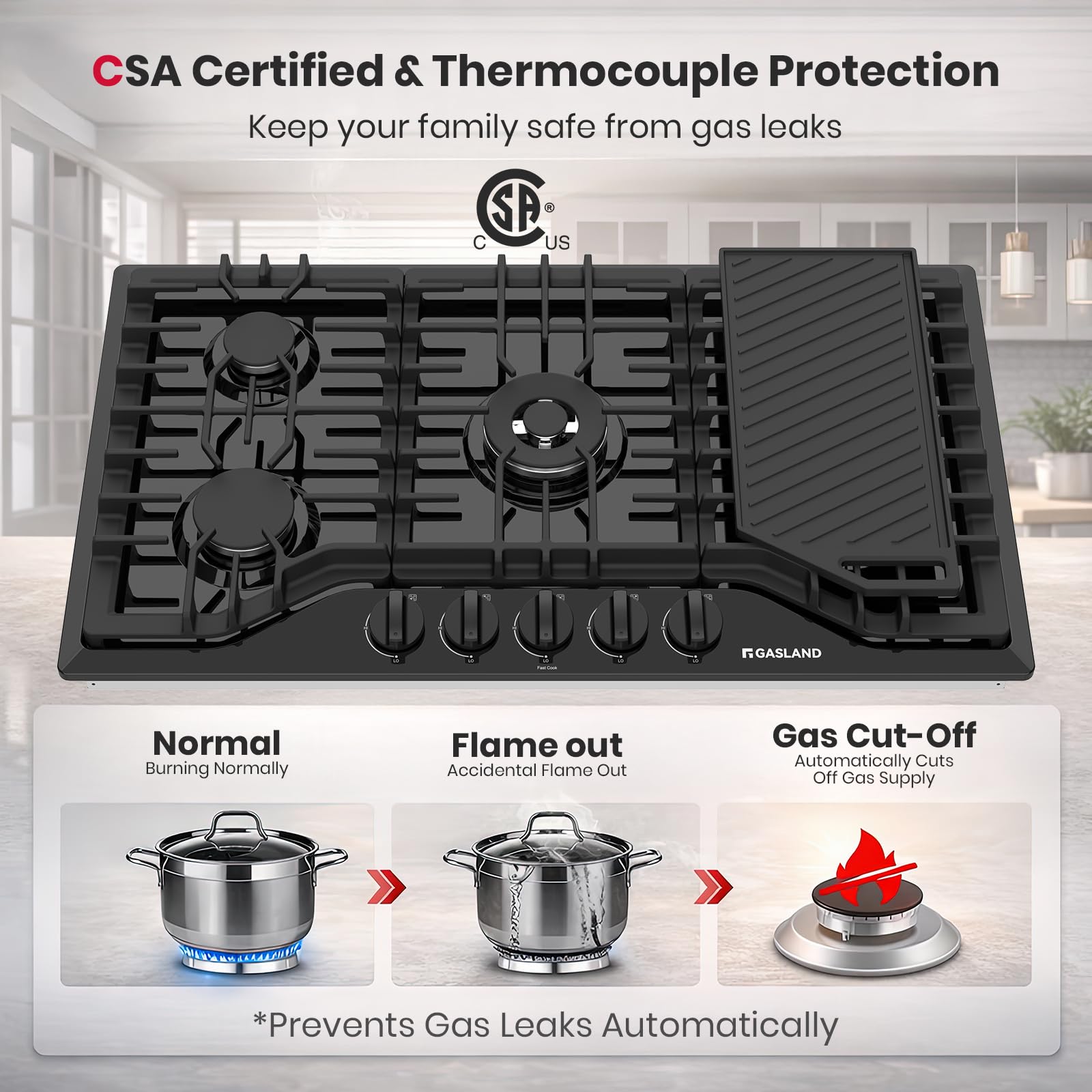 【Thermocouple Protection + CSA Certification】This 30 inches NG/LPG gas stove-top is CSA certified for US and Canada use including a CSA certified gas pressure regulator. The thermocouple flame-out failure device system(FFD) will shutoff the gas automatically if a flame is not detected to ensure your safety in an emergency.