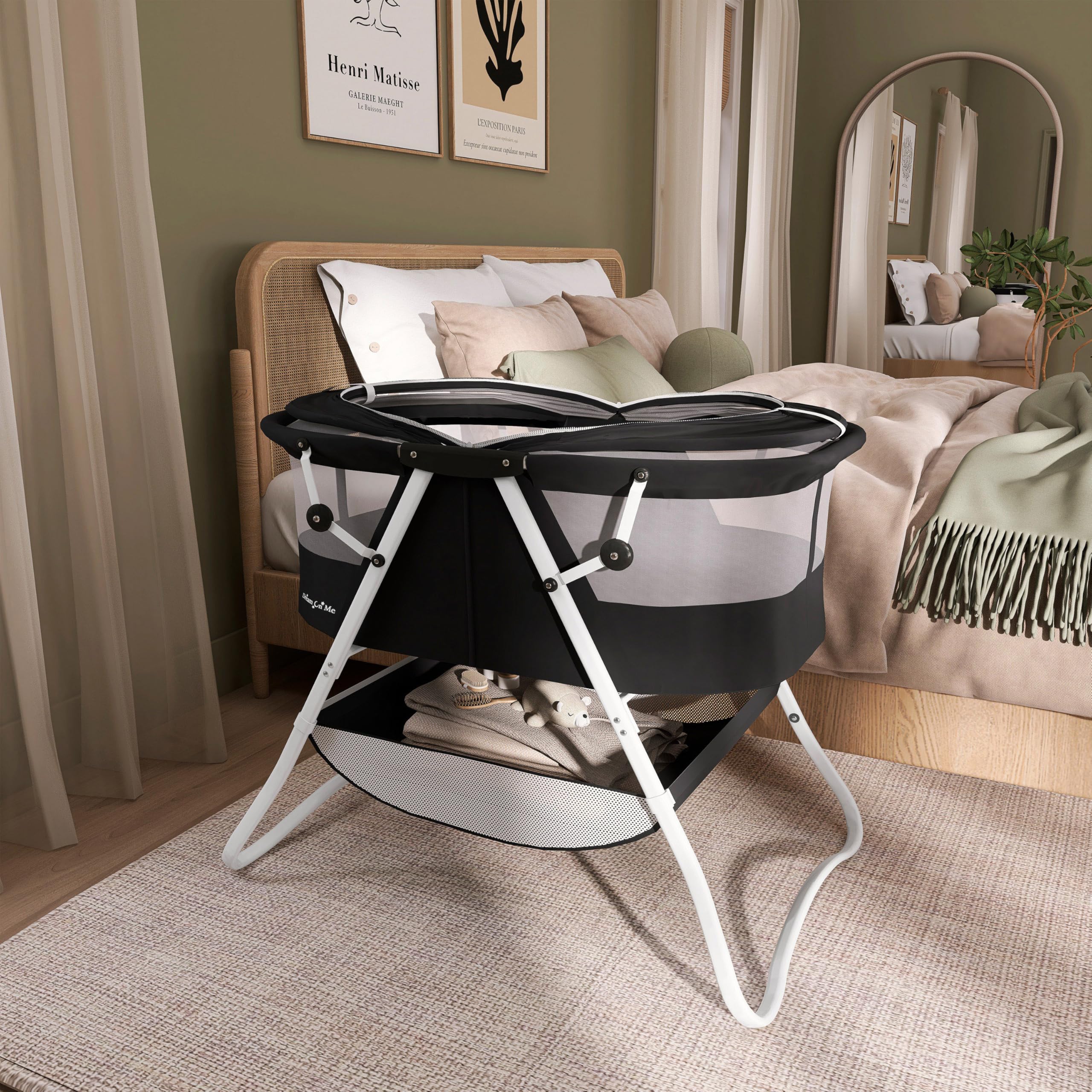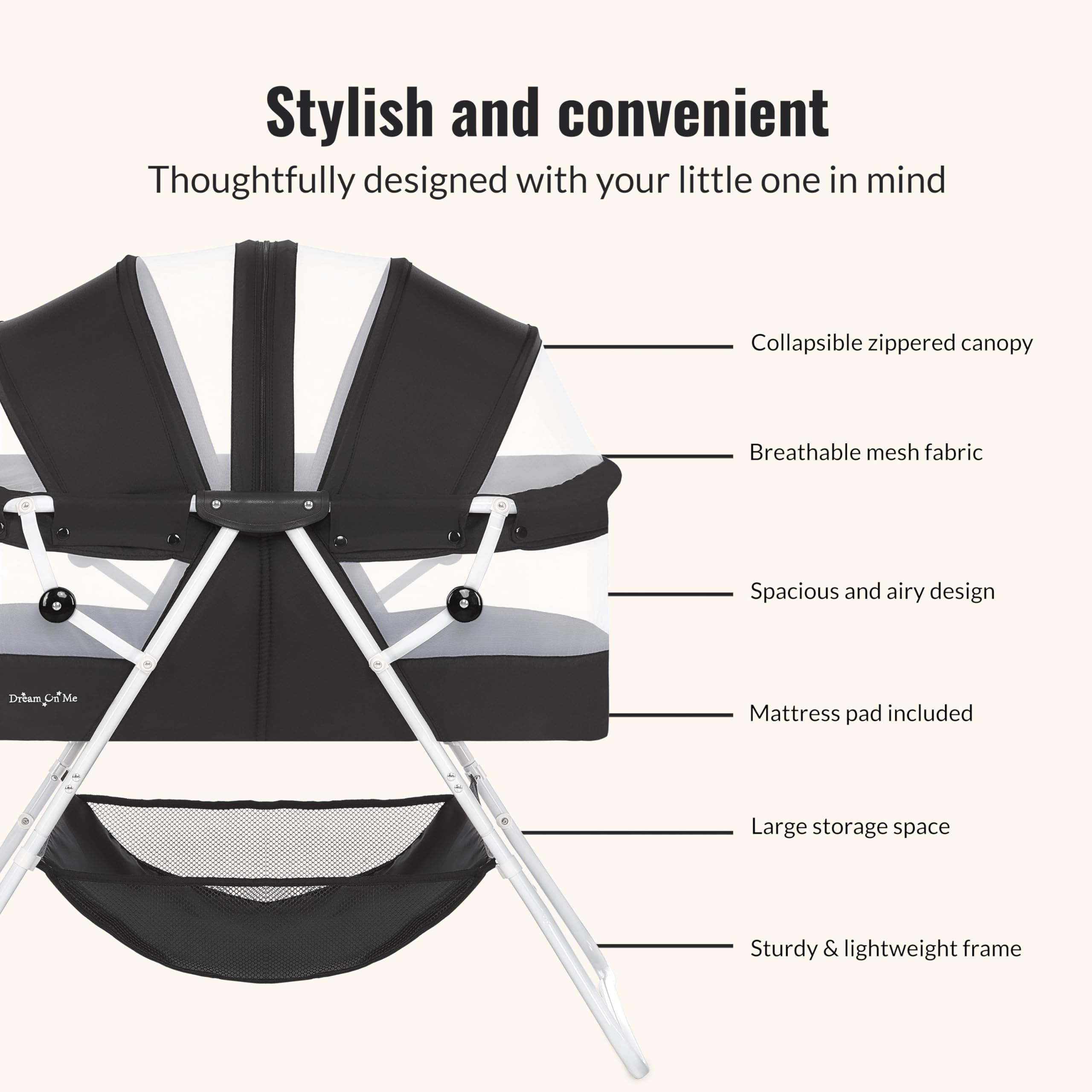LIGHT and VERSATILE:The Karley Bassinet is designed with a lightweight aluminum frame that allows you to move it easily from room to room. It comes with a no-tool assembly and quick-folding mechanism. Use it indoors and carry it outdoors without any hassle