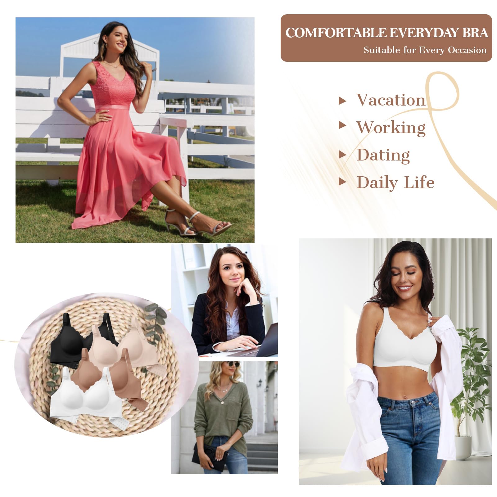 Seamless Bras for Everyday Wear - These seamless bras ensure invisibility under clothing, giving you the freedom to mix and match with different styles. They can serve as everyday bras, sleepwear, lounge bras, minimizer bras, and are flattering to pair with t-shirts, blouses, suits, cardigans, or sweaters. A sports bra ideal for light activities like yoga, dance, or walking.