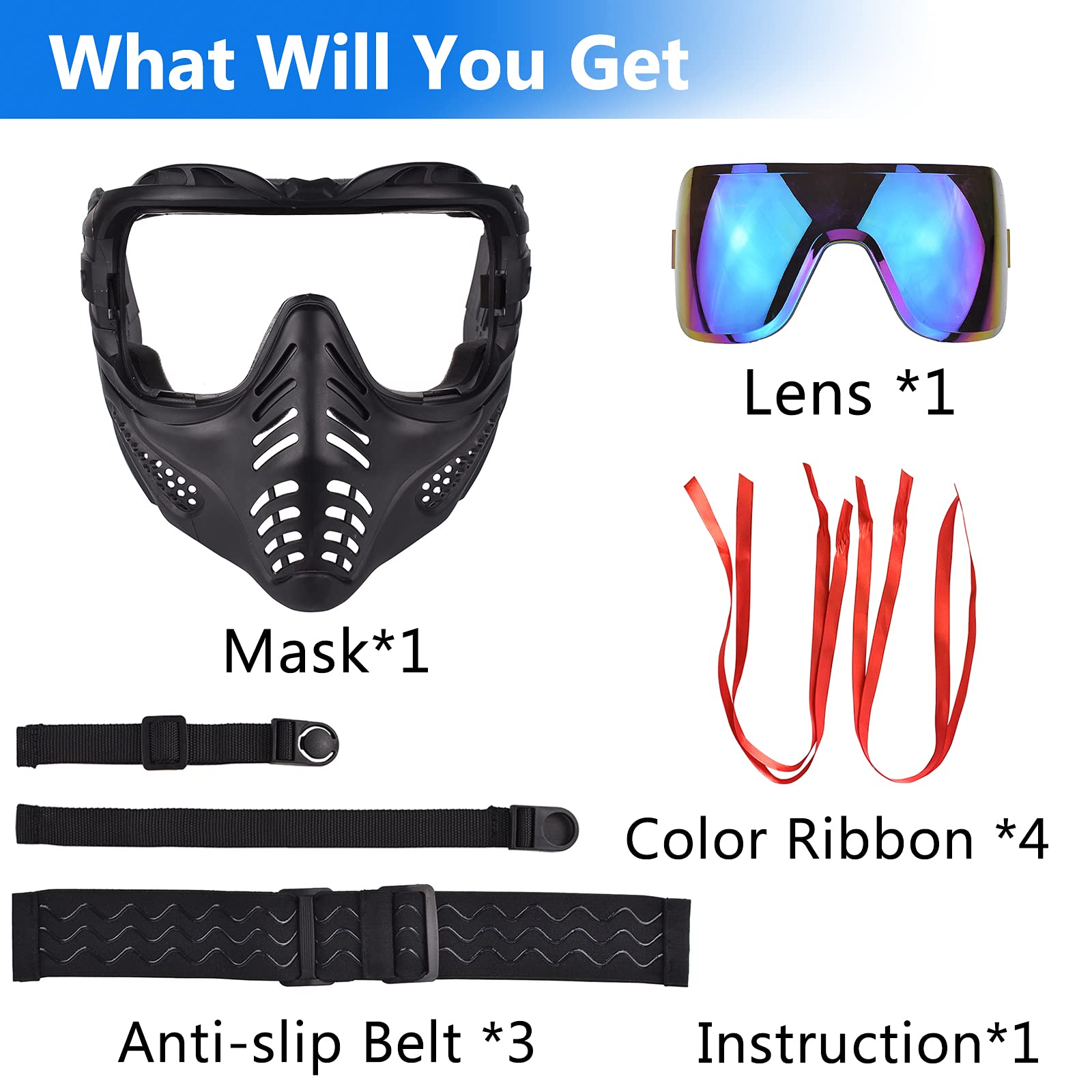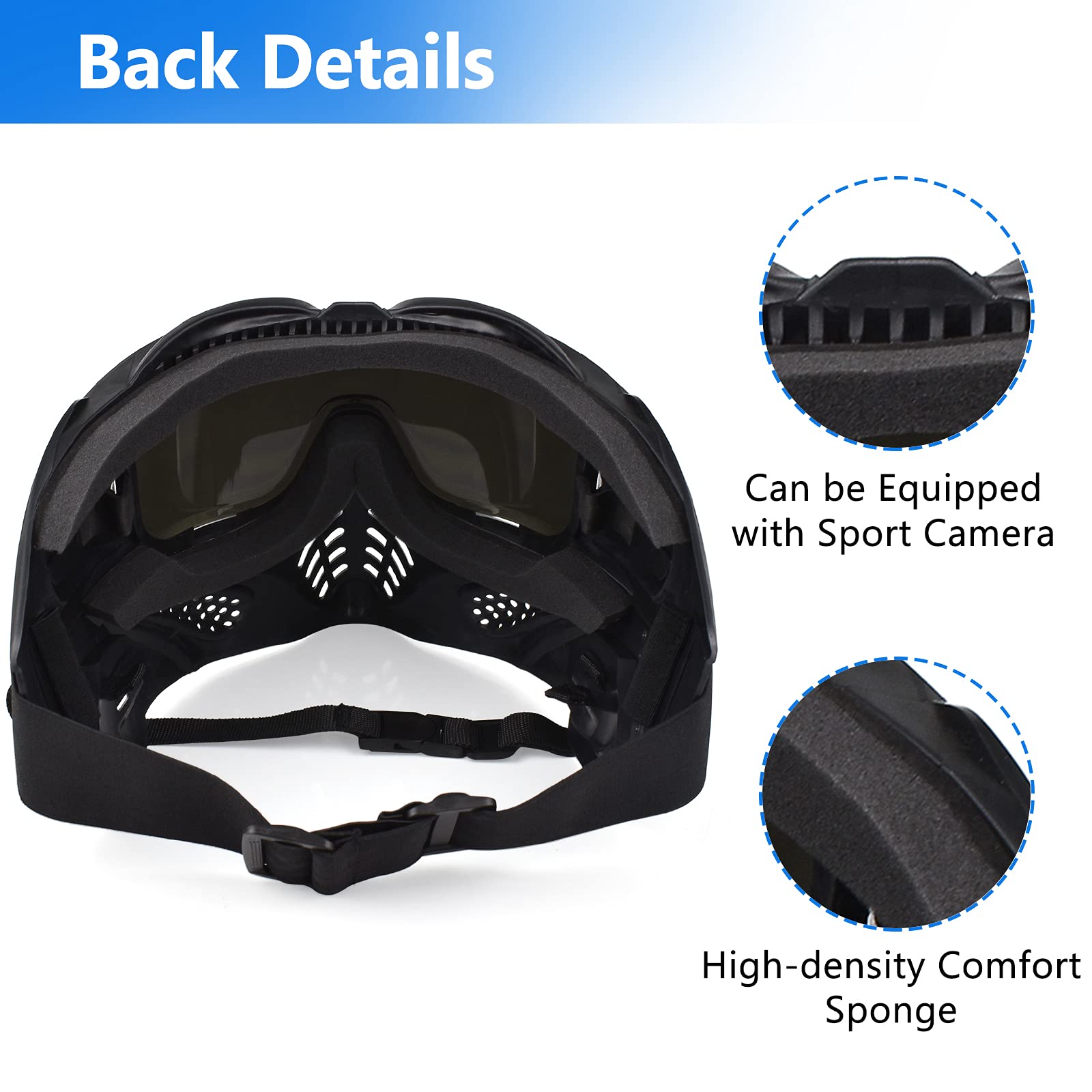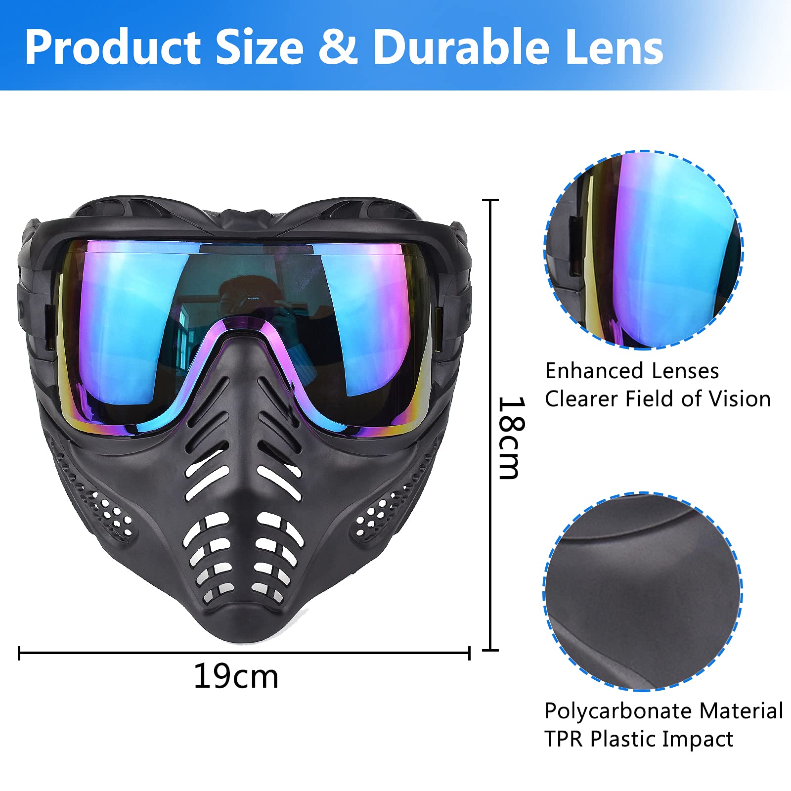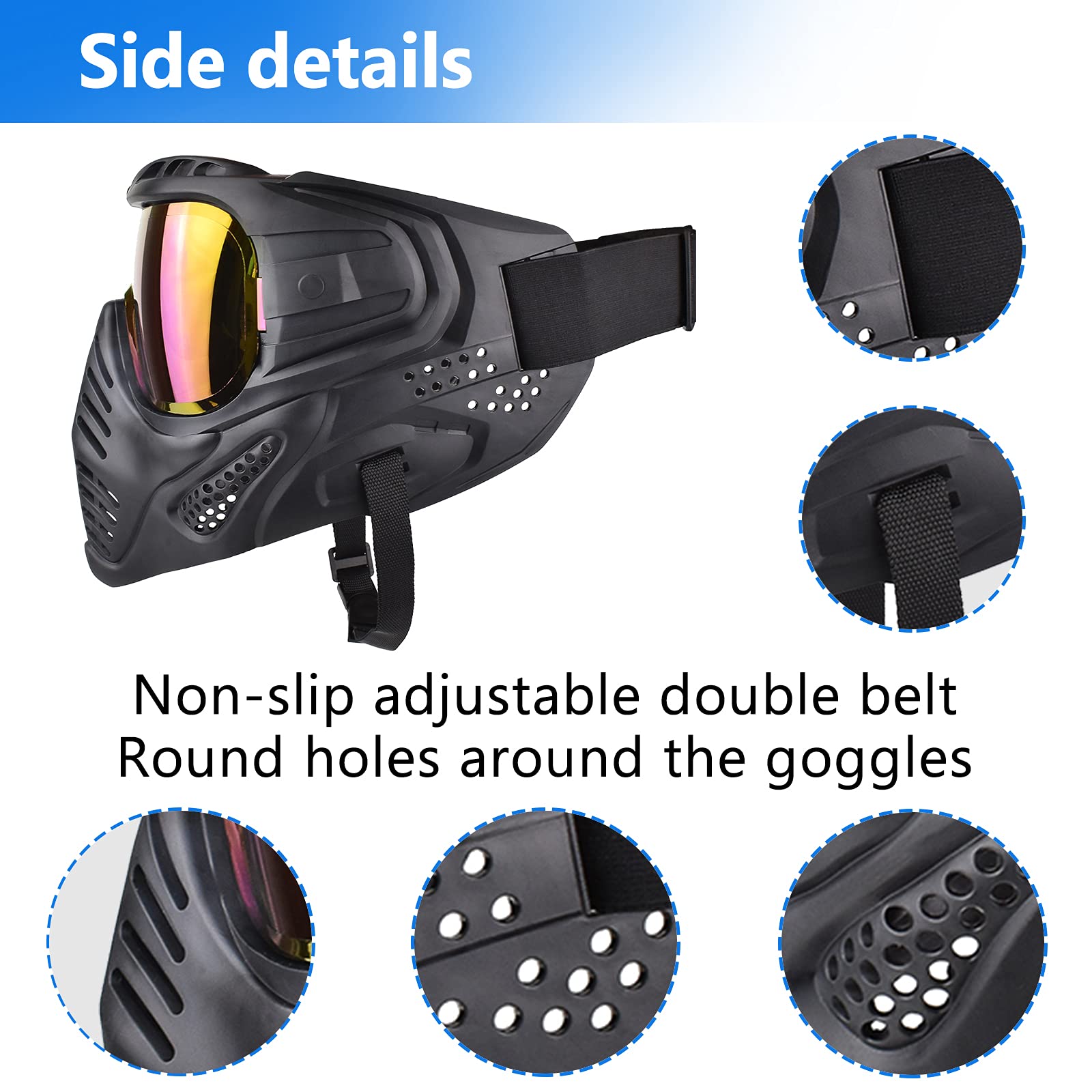 Ergonomic design & Ventilation - Airsoft mask internal soft cushion as well as high-density comfort sponge. Effective relief of facial pressure, great protection for Beginners by ergonomic design. Non-slip belt, adjustable elasticity to adapt to the shape of the user's head. There are round holes around the goggles to help the internal air circulation.