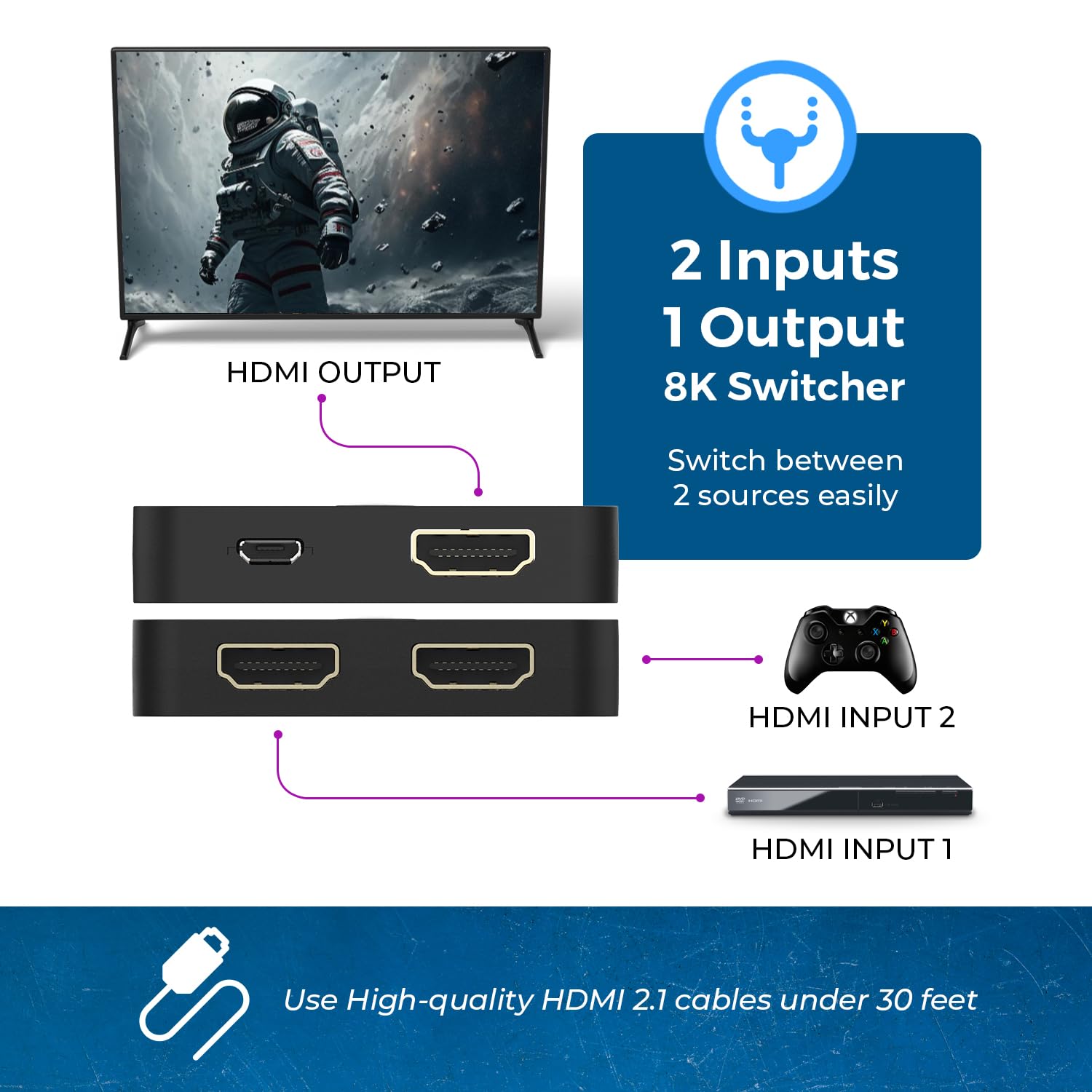 8K@60HZ HDMI Switch - This switch allows you to easily switch between 2 HDMI Sources to one HDMI Display. This switcher is designed to handle maximum resolutions of 8K@60Hz, also supports 4K@120Hz, 1080p@240Hz. HDMI 2.1, HDCP 2.3/2.2/1.4, HDR10+, HDR10, Dolby Vision, 3D, CEC, and High Speed 48Gbps Video Bandwidth.