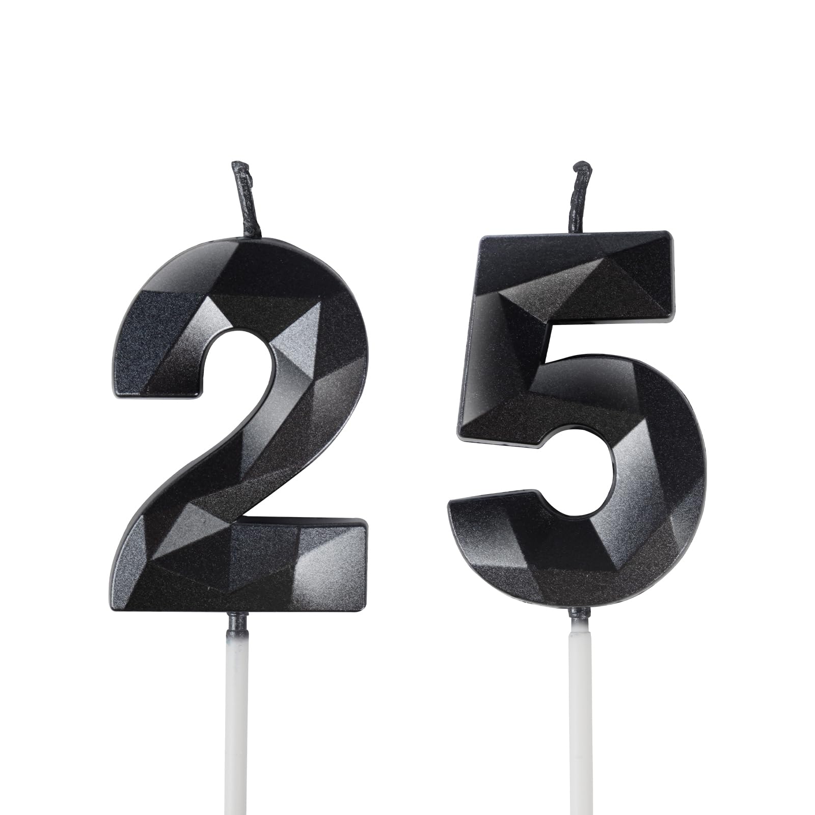 25th Birthday Candles,Number 25 Candles,Black Happy Birthday Candle for Cake,3D Design Cake Topper Decorations for Women Men Birthday Party Wedding Anniversary Celebration Supplies Features: 3D Delicate appearance: The happy birthday cake candles are meaningful for you to celebrate your birthday and nice cake topper decoration for embellishing your cake and cupcake, bright glow for creating romantic atmosphere and adding a touch of elegant. Adapt to the venue: Ideal cake decoration for many occasions, such as birthdays, pet birthdays, baby showers, anniversaries, retirement parties, family reunions, weddings, Hawaiian parties, even Christmas, must-have items for party cake, bring you memorable and meaningful party. Specifications: Quantity: 2 piece Material: wax, plastic Candle length: approx. 5 cm/ 1.97 inch Total length: approx. 11.5 cm/ 4.5 inch Color: as pictures shown Package includes: 1 x Black Number 2 and 5 Numeral Cake Candles Warm notices: Please allow little error on the size due to manual. Do not leave the lighted candles unattended. Please place candles out of reach of children. And please do not light candles on or near flammable materials. Please keep the candle away from the fire when not in use, when burning, adult's supervision is needed.