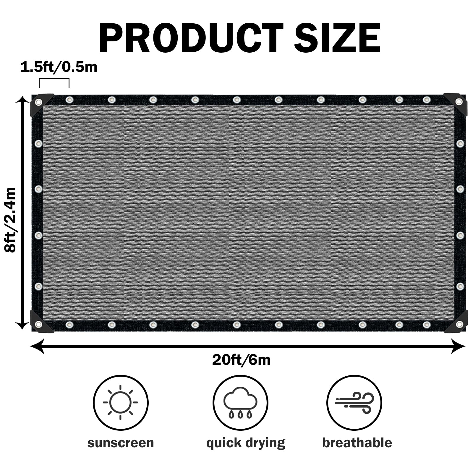 Premium Material: The shade fabric is made of high-density polyethylene (HDPE). It is a high-quality knitted fabric with excellent tear and abrasion resistance. At the same time, sun screens for patio allows the circulation of air and light, ensuring good ventilation and temperature control; its design allows rainwater to pass through and prevents water accumulation.