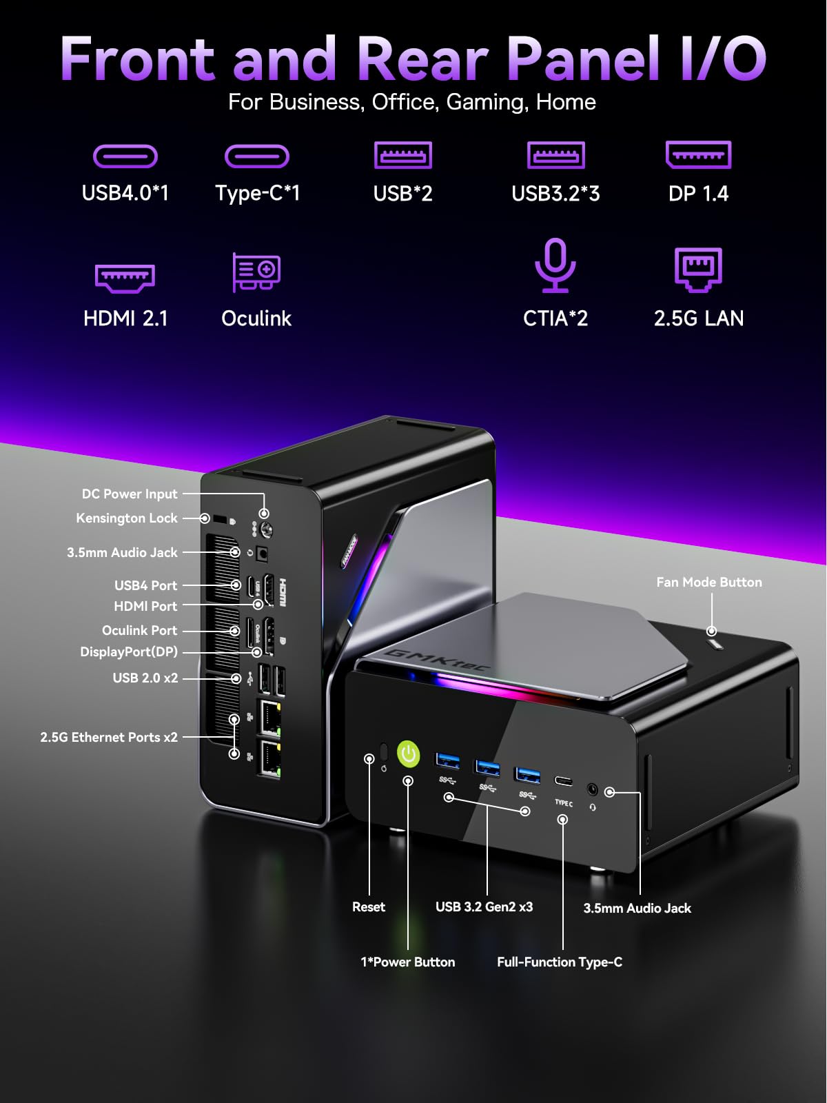 DUAL COOLING FANS WITH LIGHTING - Turbo CPU fan + a massive DDR5/SSD cooling fan deliver silent, ultra-efficient cooling (just 35dB in Quiet Mode!), while the advanced heatpipes and 360° airflow keeps your Ryzen Mini PC frosty under heavy loads. Plus, 13 dazzling RGB lighting modes let you personalize your rig’s vibe