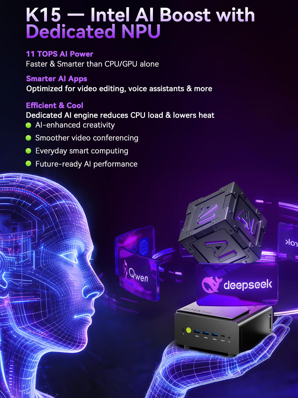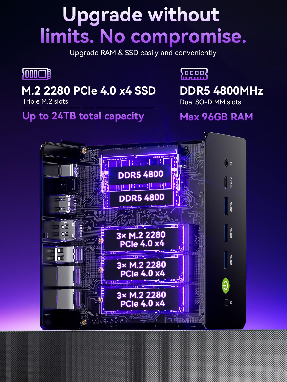 48GB DDR5 RAM + 1TB SSD - The K15 mini computer is equipped with Dual 24GB (Total 48GB) SO-DIMM DDR5 4800MHz memory sticks. 1TB PCIE 4.0 SSD Drive with 3x M.2 2280 Expansion slots. Each slot capable of reading up to 8TB. (24TB MAX)
