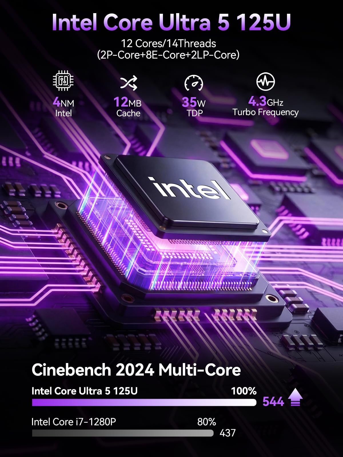 LOW ENERGY HIGH PERFORMANCE MINI PC - The Intel Core Ultra 5 125U is part of the Ultra 5 lineup, using the Meteor Lake architecture with BGA 2049. Intel Hyper-Threading technology is available and effectly doubles the core-count of the P-Cores, to a total of 14 threads. Core Ultra 5 125U has 12 MB of L3 cache and operates at 1300 MHz by default, but can boost up to 4.3 GHz, depending on the workload. With a TDP of 15 W, the Core Ultra 5 125U consumes very little energy but outputs high performance efficiency